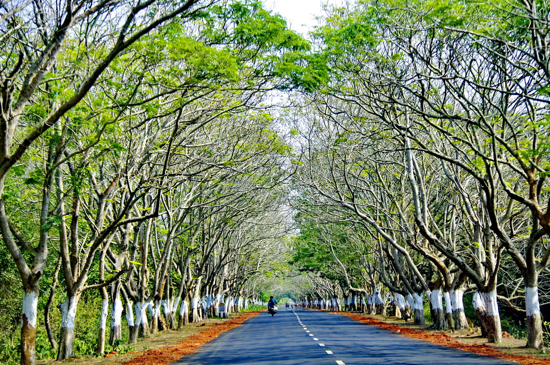印度普里,通往科纳克太阳神庙的路上。有这么一条路,虽然很多次走过这条路,但却总让我印象深刻。因为树种不同,走过一个区域便会出现一种景象。只是在一个月内,却如四季变幻一样,先是繁密的绿叶,接着出现了红叶,有了果实,有了黄色落叶,有了光秃秃的树干...不管如何,树干都遮盖了整条路,道路两旁的树被漆成等高的白色,更加重了延伸感,走在这样的路上,总让人有种回家的感觉。