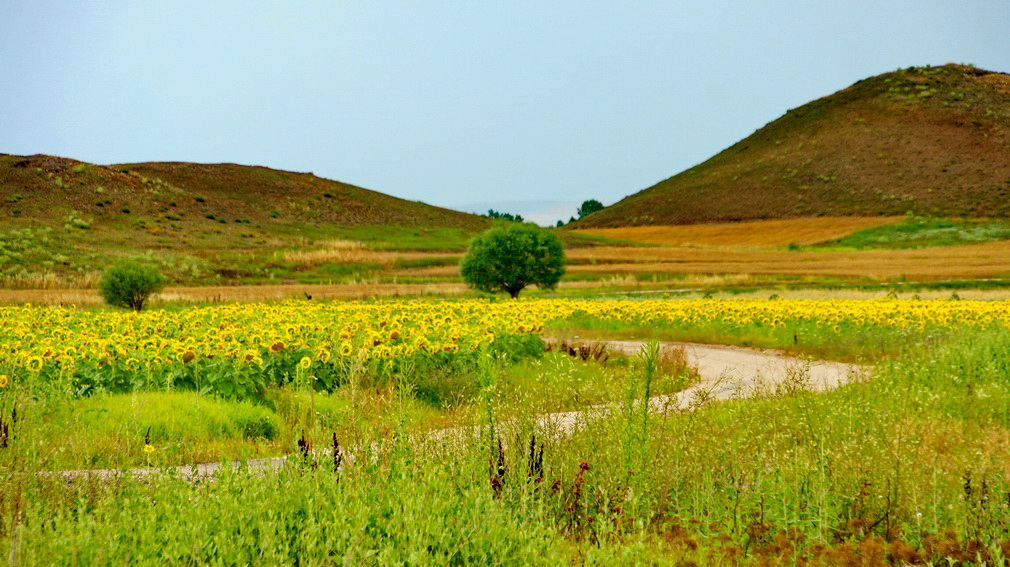 土耳其之路。结束黑海沿岸的骑行之后,开始前往首都安卡拉,沿途的路总是充满了诗情画意,起伏不大的山峰,汩汩流淌的泉水,新鲜的空气。沿途大片的农场里有这片的向日葵花田。