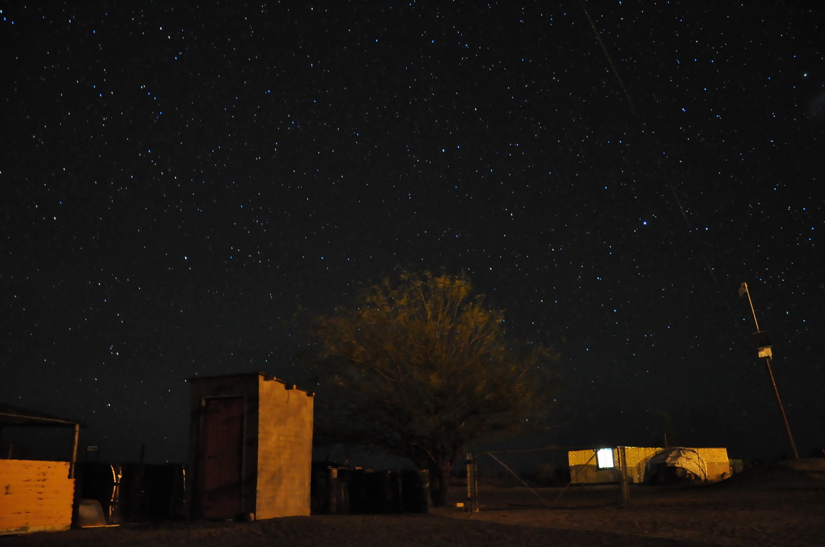 纳米比亚和南非边境,几十公里没有人烟。不过我们很幸运,在夜幕降临的时候看到一个农场,夜晚在农场的院子里宿营非常安全。当地人很早就歇息了,八点钟坐在院子里看漫天的星空。