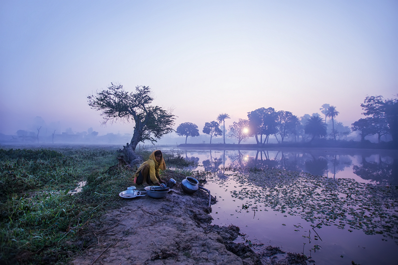 晨雾中洗涤餐具的异国少女