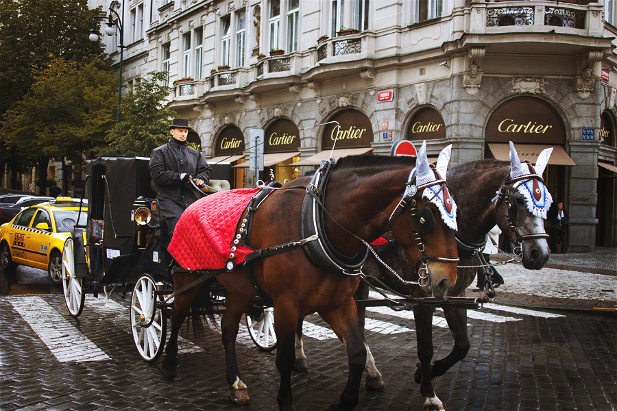 布拉格老城广场,马车。这是一幅古典与现代的画面——一条画着斑马线的石板路,一辆紧随着马车的taxi,以及这个古典风格的cartier专卖店。