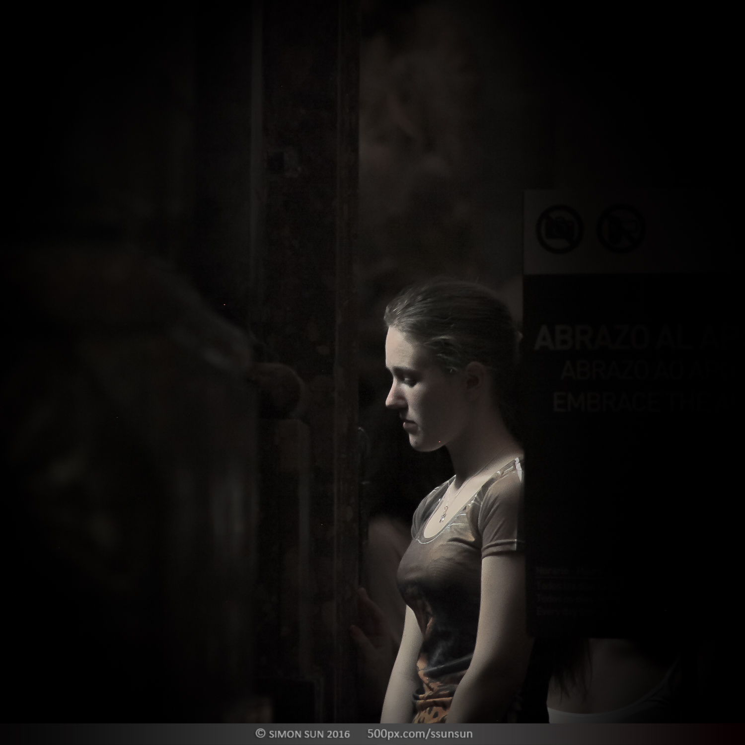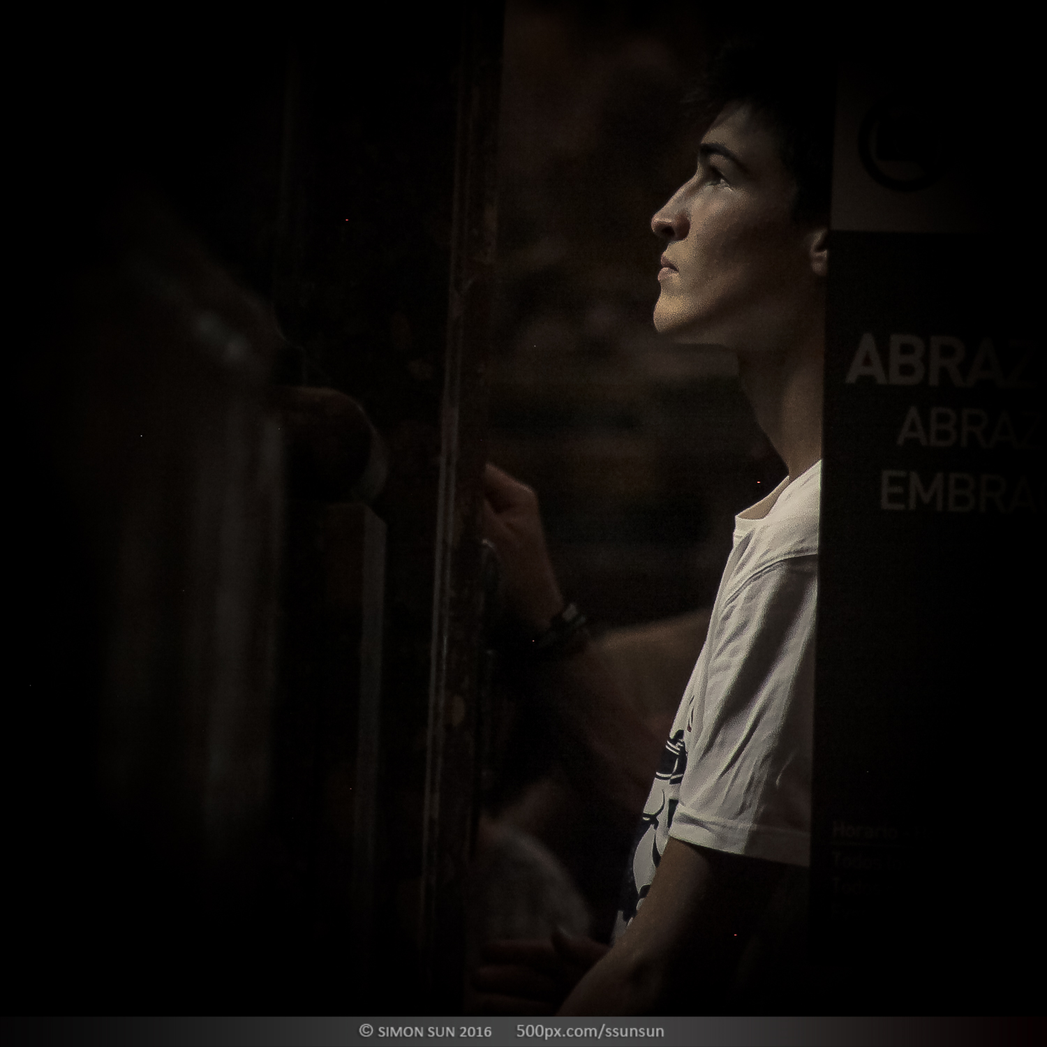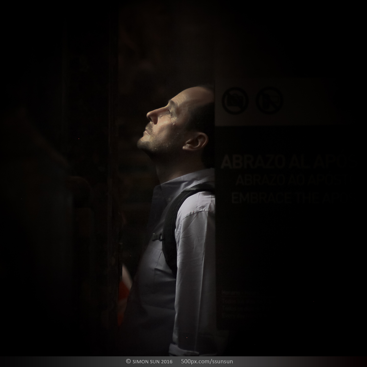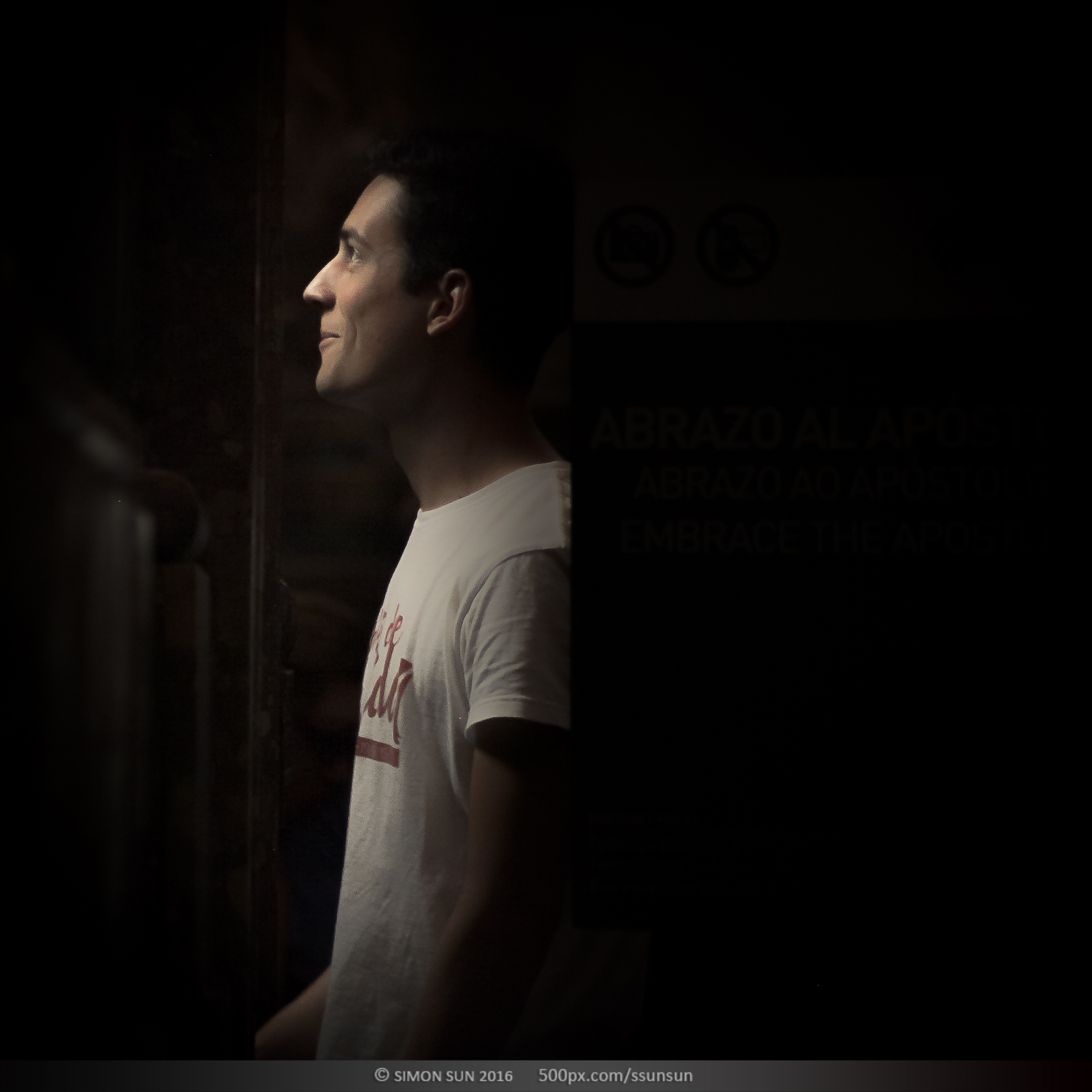 上帝说要有光。圣地亚哥主教大教堂,著名的朝圣之路的终点。这座11世纪建造的教堂祭祀着基督的12门徒之一雅各(圣詹姆斯)。12世纪左右他被推崇为基教西班牙的守护圣人。在地下祭坛中安置着他的遗体,教堂中雅各的雕像终日被朝圣的人群亲吻抚摸,来自世界的不同地方的朝圣者沿着朝圣之路历尽辛苦,最终来到这里,每个人的心情都不同。我躲在一个完全不打搅信徒的位置,记录了他们进入圣殿瞬间的表情。拍摄了昏暗中的100个人。在这里有震惊,有悲伤,有忧郁,有犹豫,有喜悦,有无奈。每个人心中都有自己的圣人,在这一刻,他们其实看见的是自己。