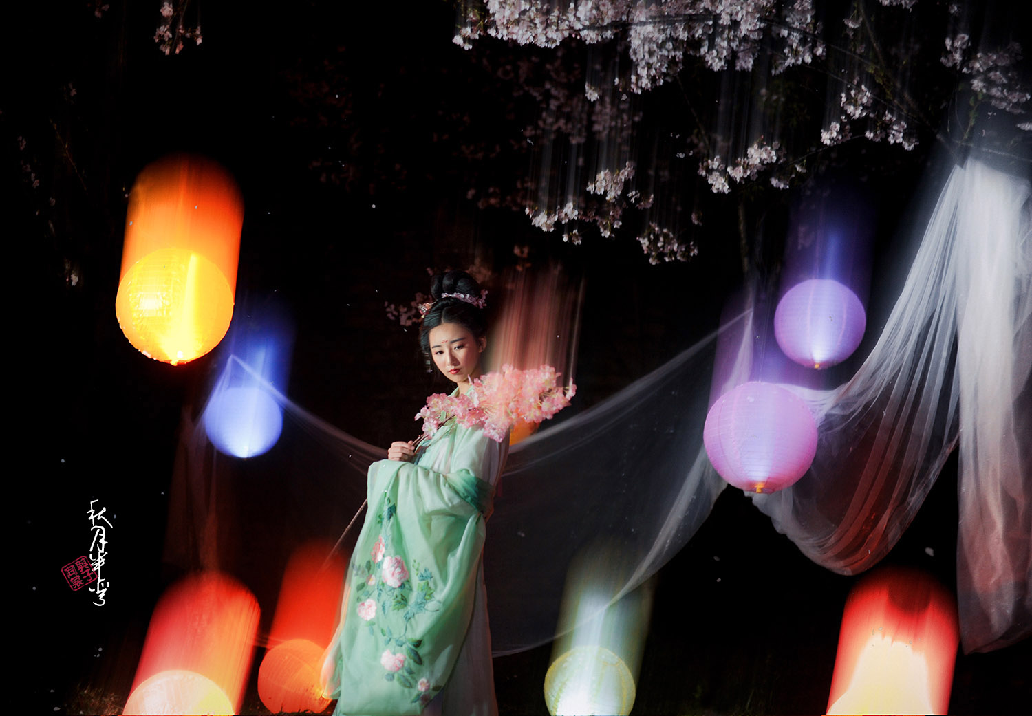 烟花绥飘雪 彩虹逐流星 暖帐醉红绡 冷雨击夜樱 桃飘妃子葬 李飞唐人吟 鸡鸣晨钟破 行人足下泥 摄影/文案:我 出镜:初卿墨如画