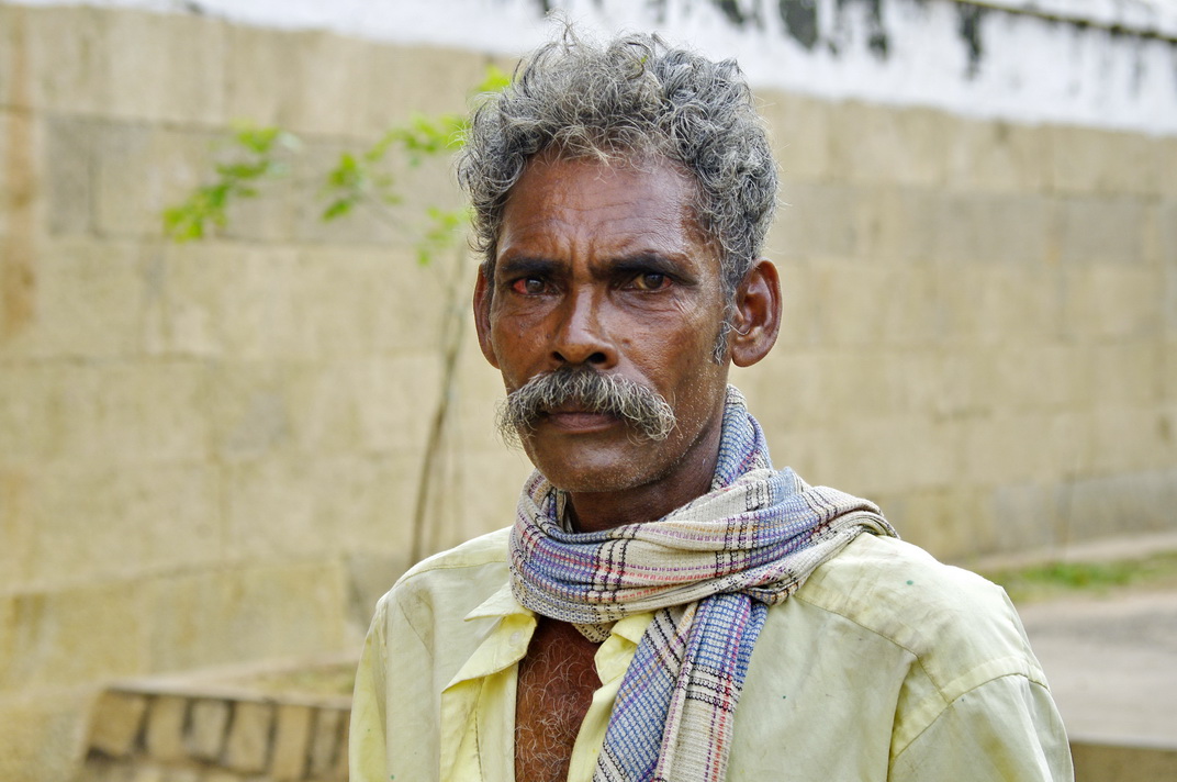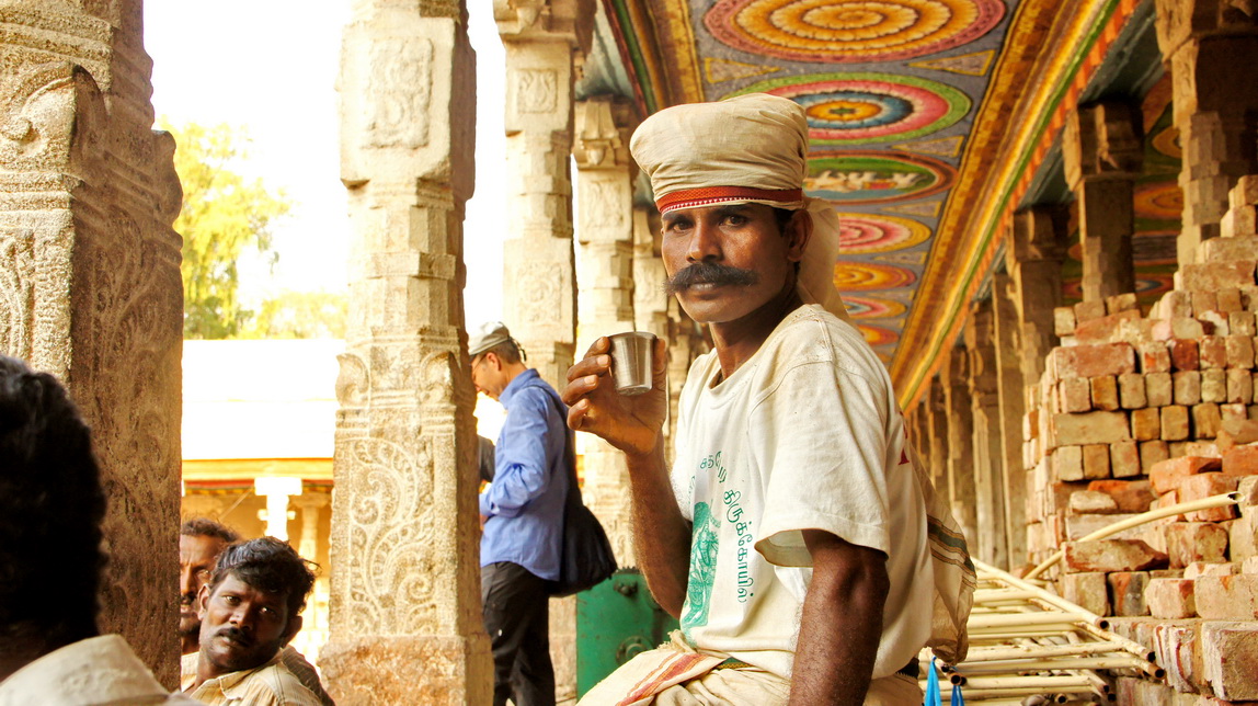 喝茶的印度民工,他们在修建寺庙内的池塘。