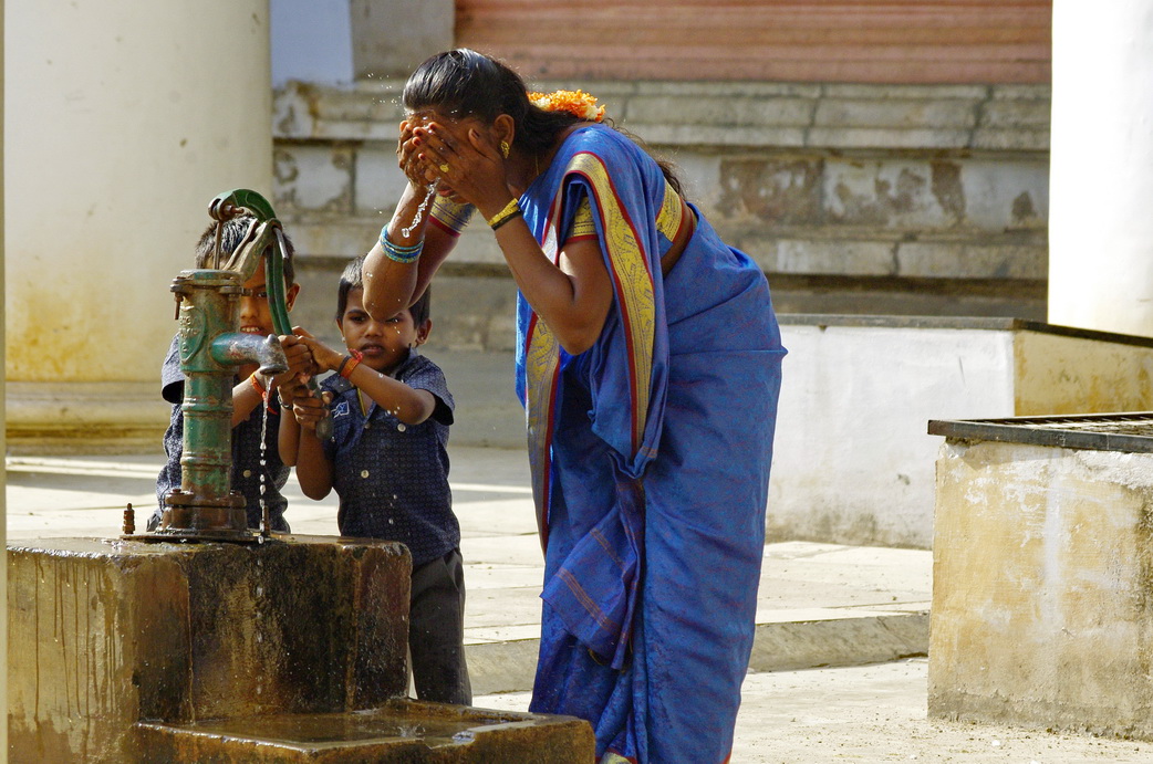 王宫内部有纯净水,可以直接饮用,另外也有这种印度到处可见的压水井。一母亲带着两个孩子在井边洗漱,天太热了!