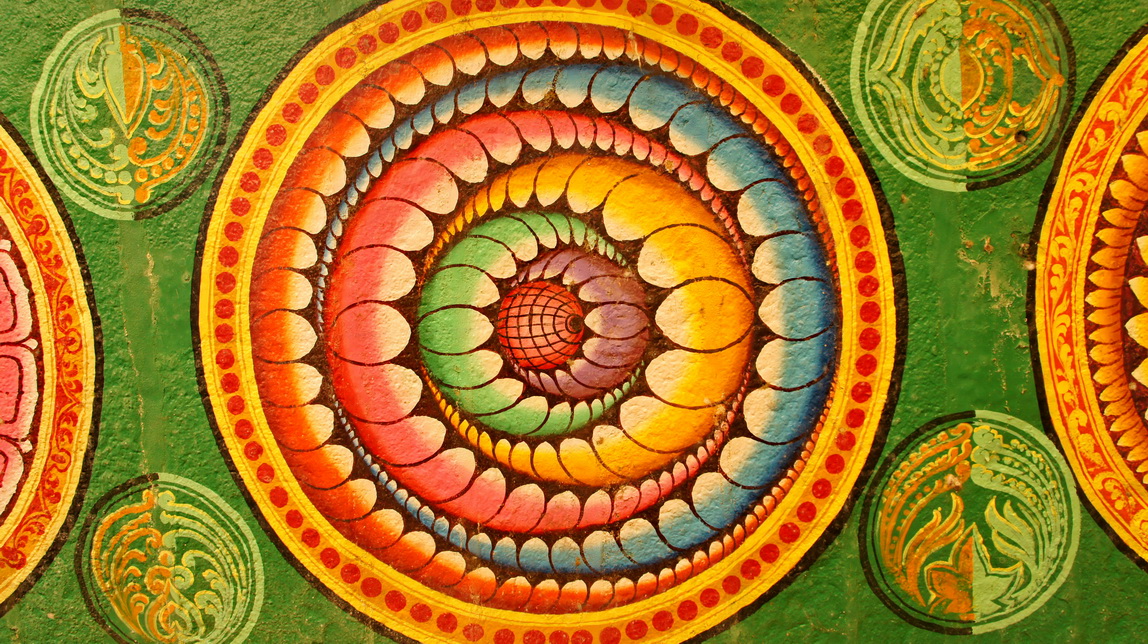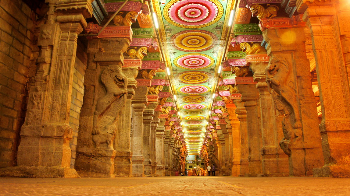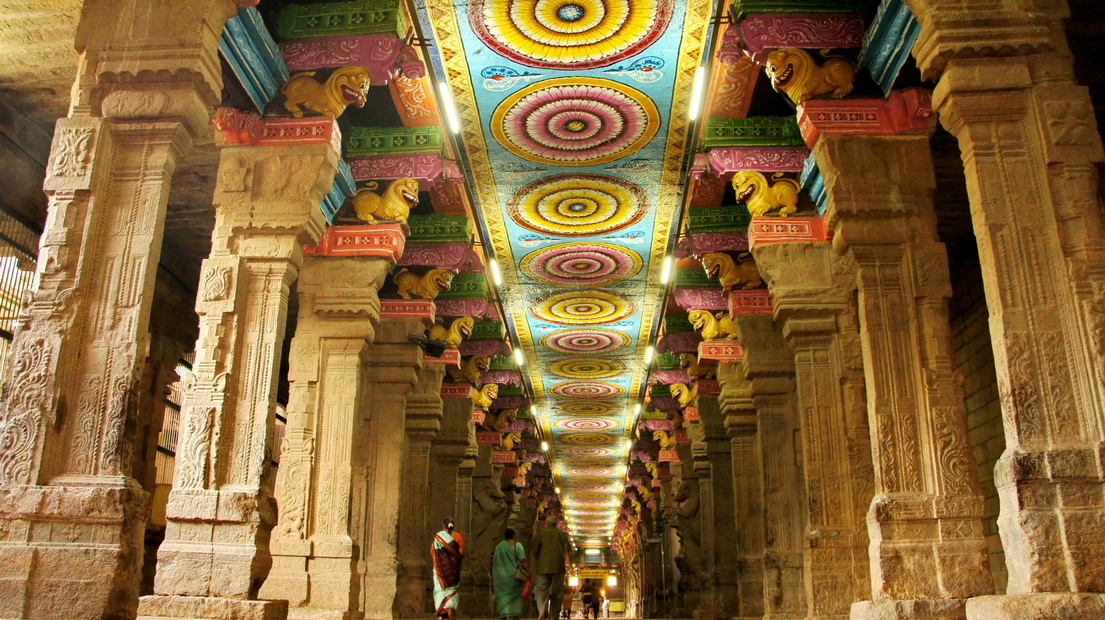 Meenakshi 庙的走廊顶部,各种颜色各种造型的原型花纹。