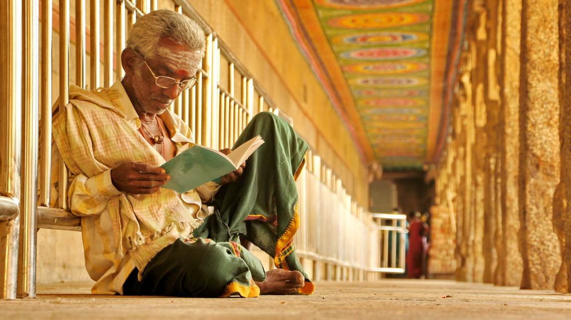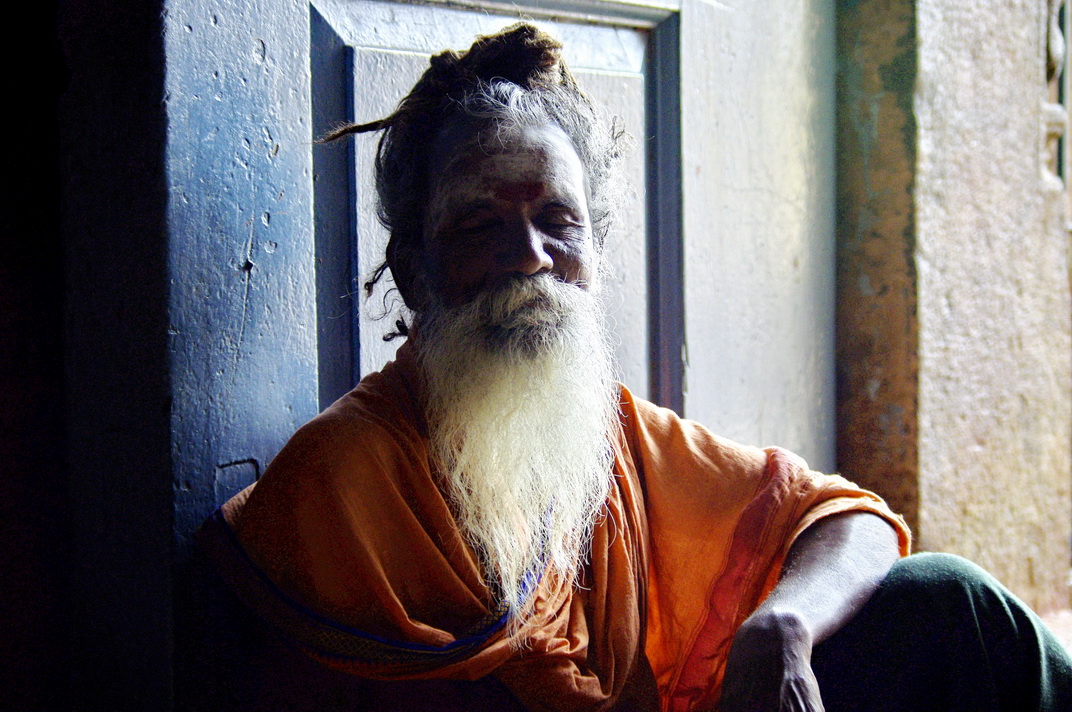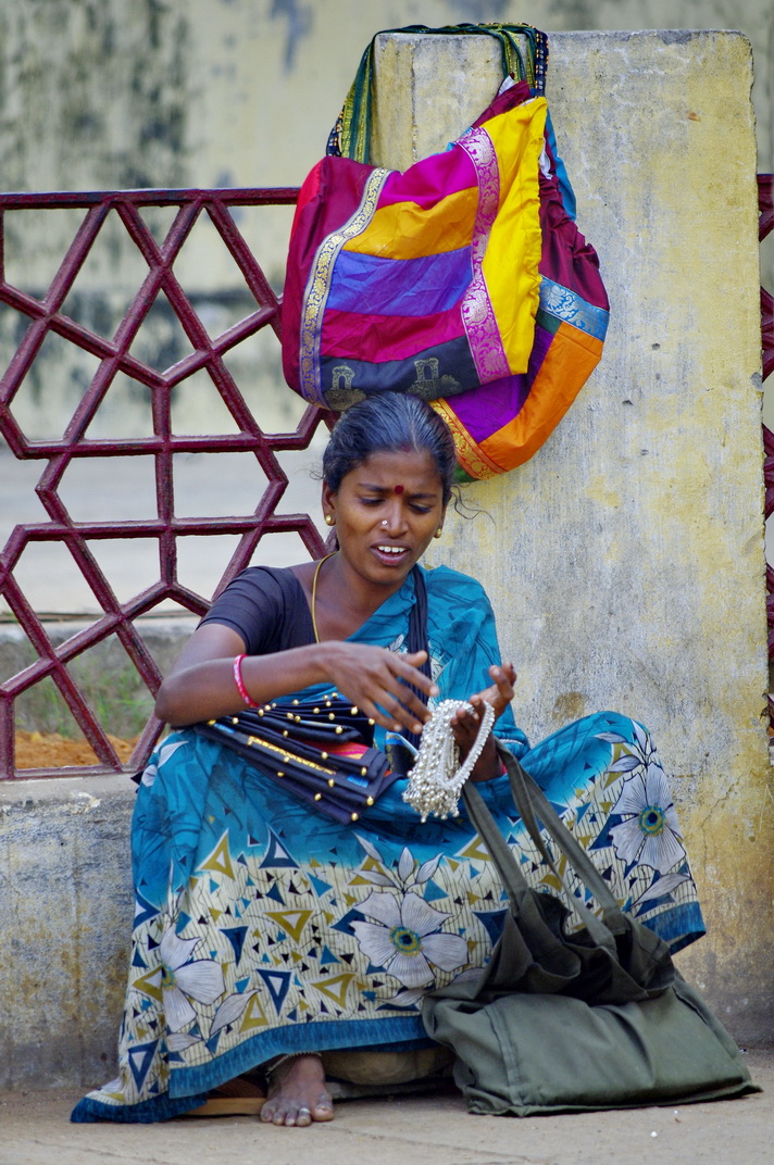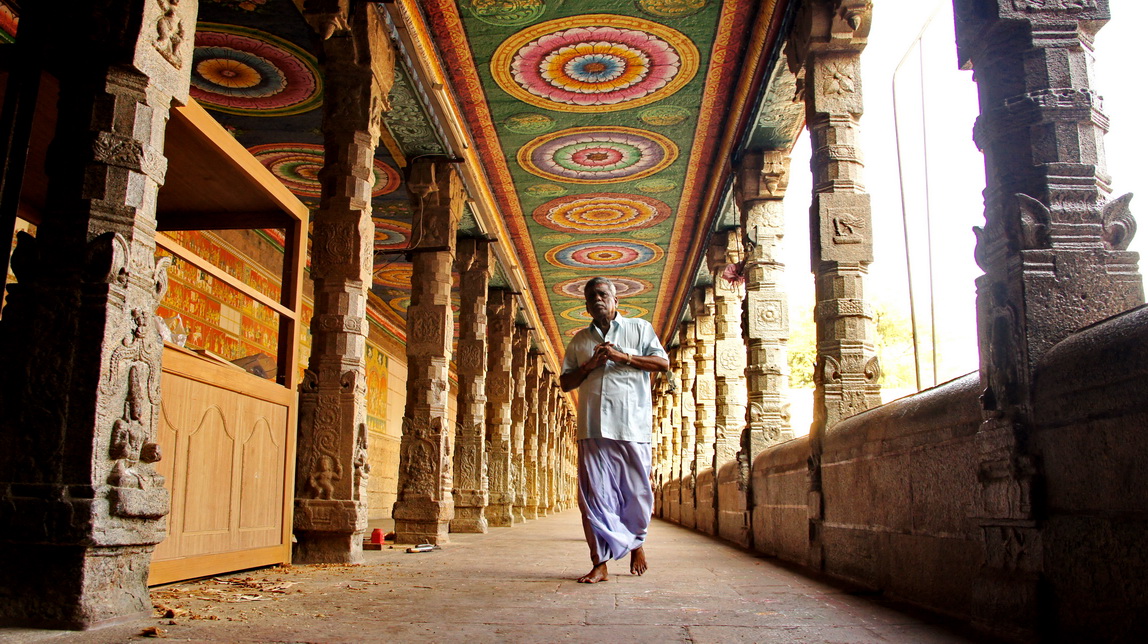 庙门口的老僧,游行的老僧,在寺庙门口闭目打坐,念经。这座庙在旁杜戈代和马杜赖的中间,有着高高的石围墙。