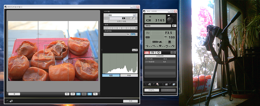 我把三脚架架好 然后就是守株待兔 因为我电脑挨着窗户所以我能看见 如果有鸟来了 我就用佳能的EOS Utility来进行控制拍摄 这样不用惊动鸟 又可以看清画面 第一张图是我用的EOS Utility和相机位置