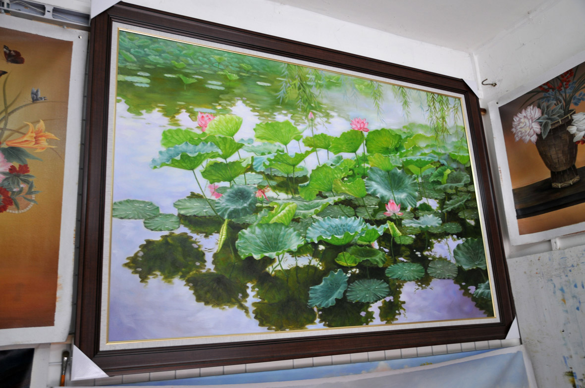 这位大哥是与我第一个交谈的画师王大哥,上边的荷花出自他手!绘画条件很有限,一张照片足以解释一切