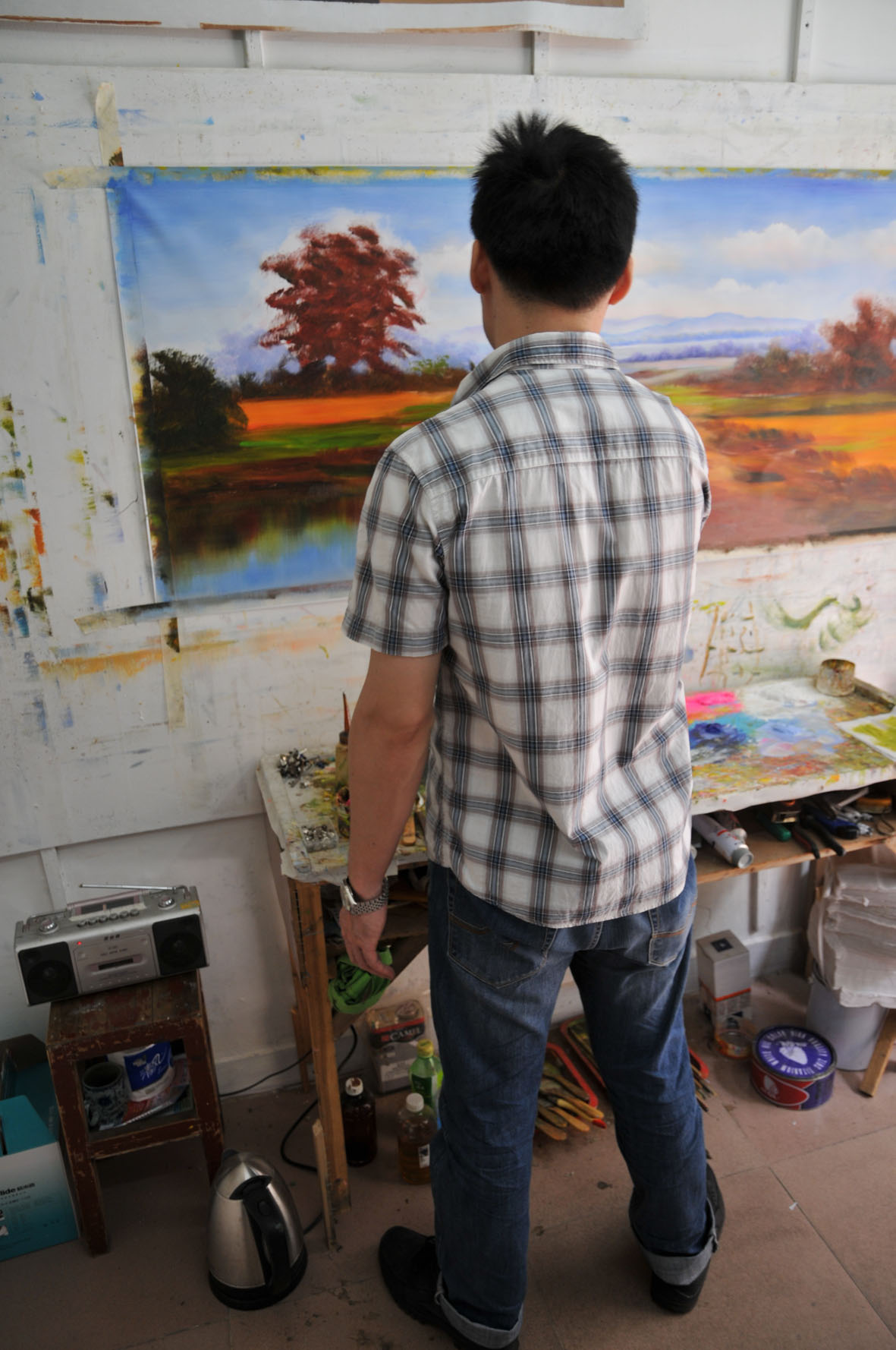 他是个很有想法。上进有远见的人,从小画画,在大芬村画画也好多年了,办公室是他自己装饰的,很有味道