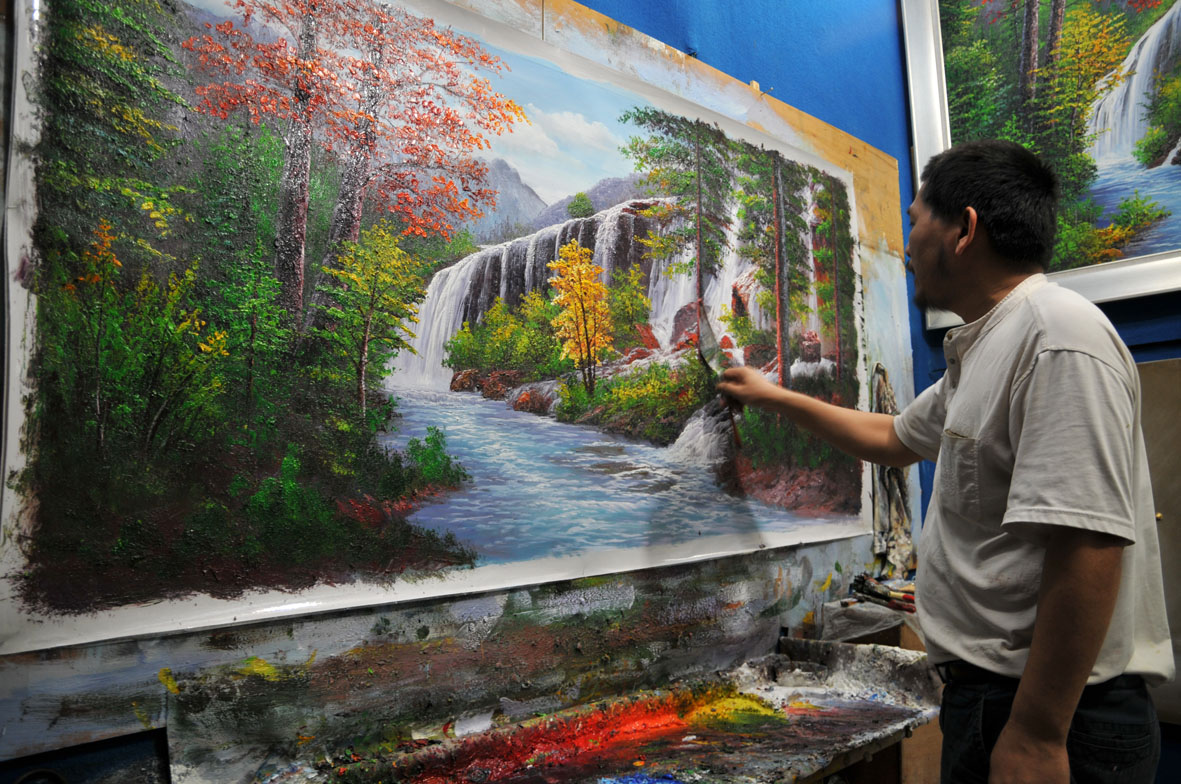 一位很豪爽的画师,擅长用丙烯,作画也二十多年了,技法娴熟……一幅商品画半个钟卖上百,难道是生计泯灭了他的原创动力?