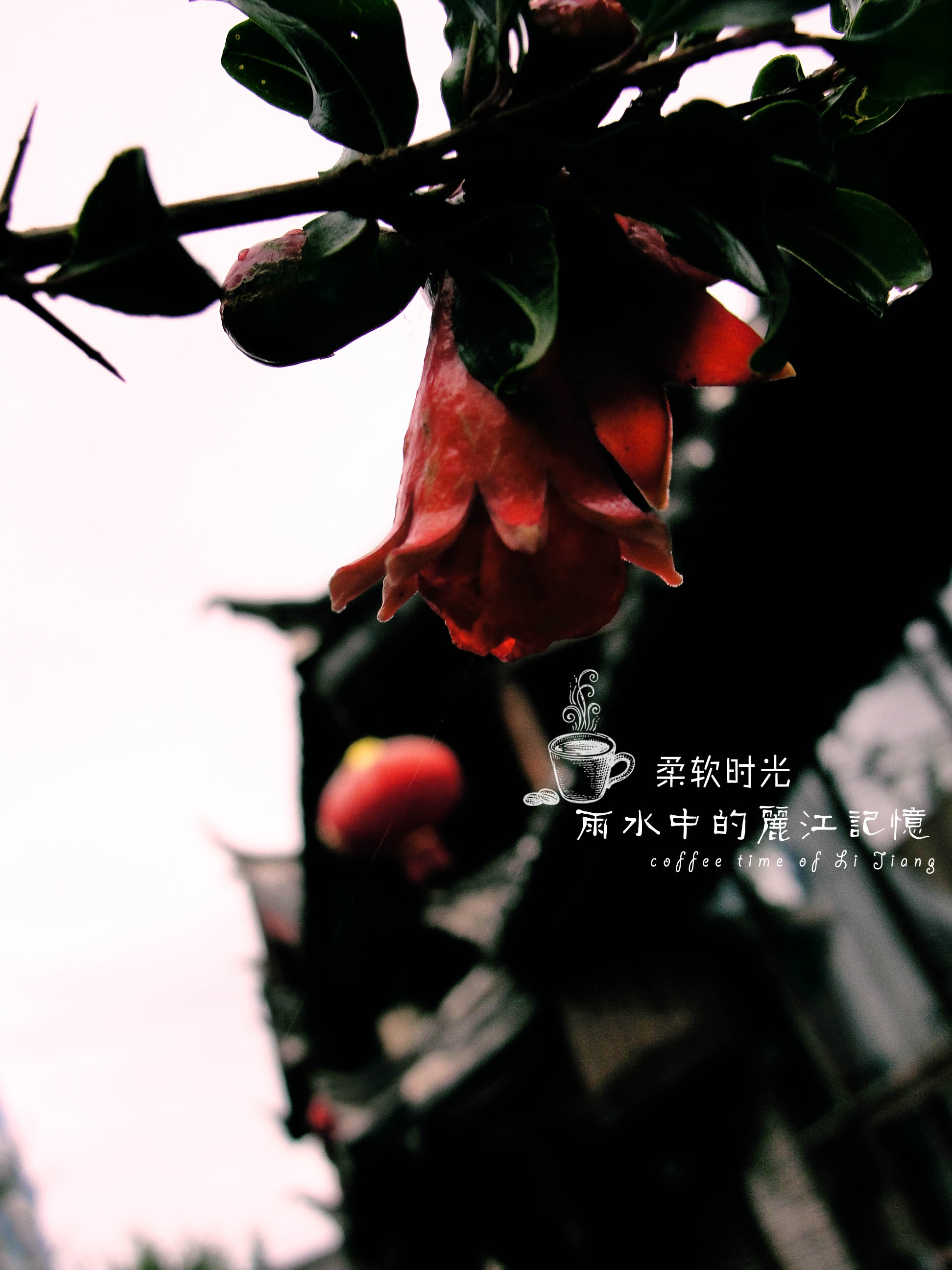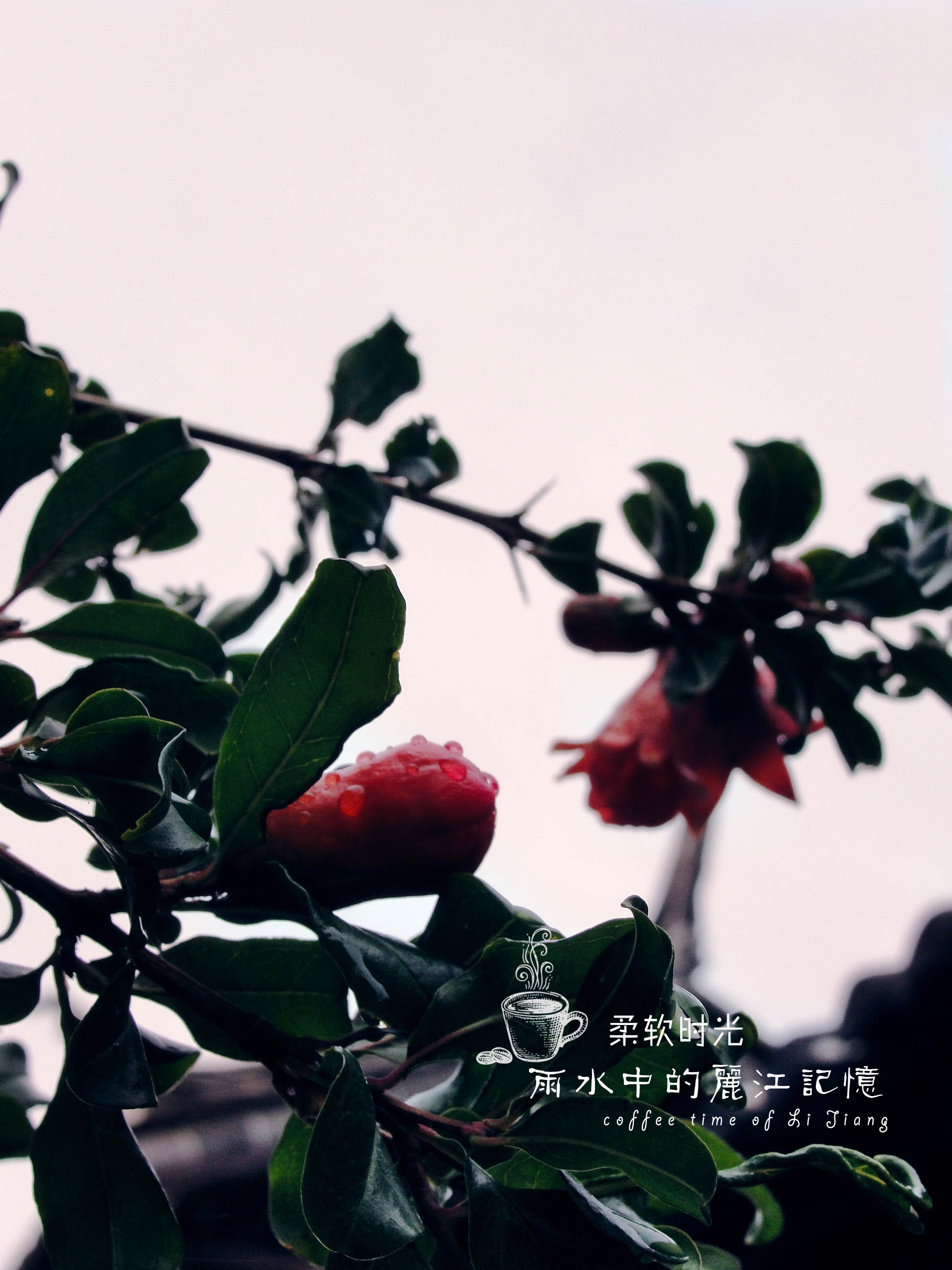 束河,清晨的雨水过后,客栈的石榴。艳丽。