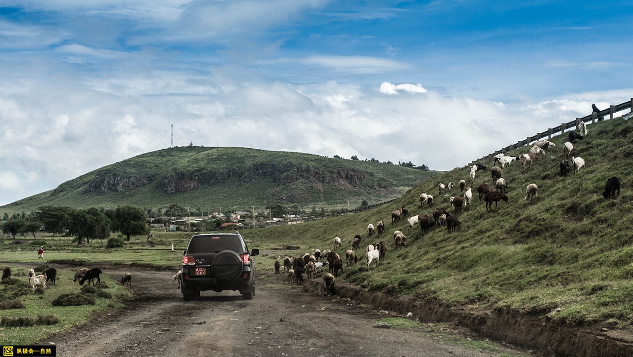 前面一辆车路过山坡上的羊群