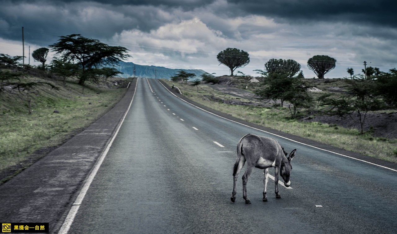 路上一只毛驴在路中间,差点撞上它。