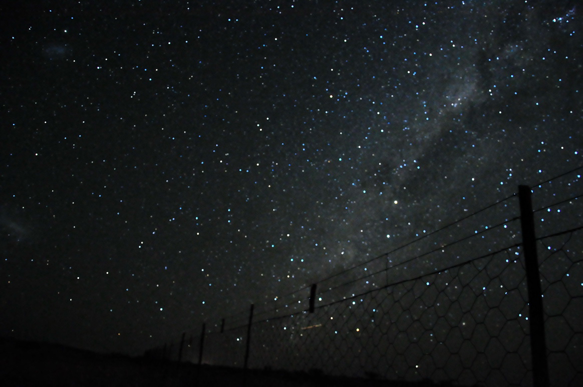 纳米比亚和南非边境,几十公里没有人烟。不过我们很幸运,在夜幕降临的时候看到一个农场,夜晚在农场的院子里宿营非常安全。当地人很早就歇息了,八点钟坐在院子里看漫天的星空。