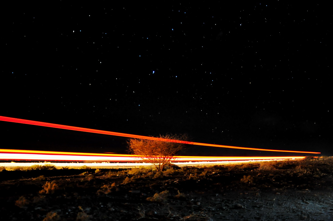 纳米比亚南部,星空下,卡车的尾灯拉出长长的线条。