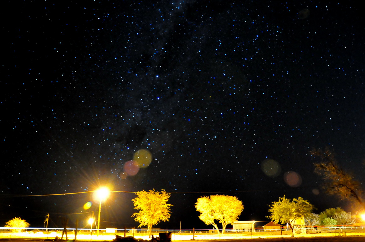 纳米比亚首都温得和克八十公里外,有一个农场,有幸得以邀请去农场住几天,休息打猎。夜幕降临,漫天的繁星总让人激动,开始尝试拍摄星空,在院子里的一颗树下,相机设置老出错,晚上天冷,冻的发抖,拍了两张就此作罢。