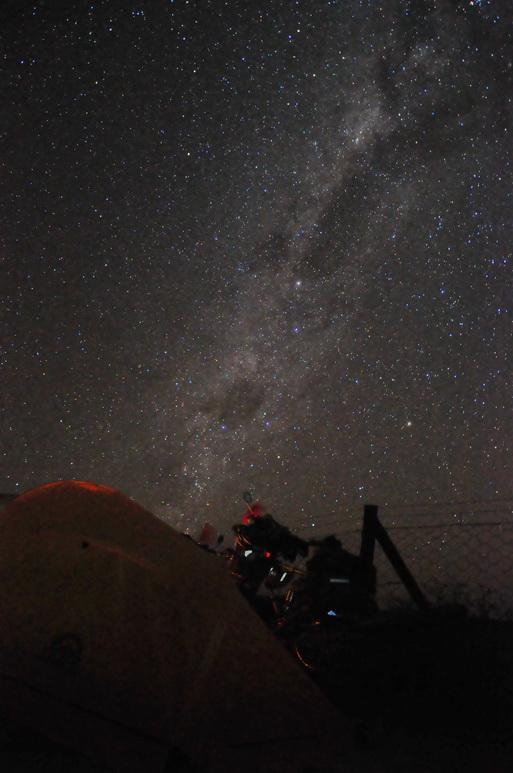 饥寒交迫已经不算什么,我所担心甚至是恐惧的是随时冲上来的猛兽。在寂静的星空下回响着我沉重的呼吸声与单调的自行车轱辘碾压道路的声音。为了抵抗恐惧,我嘴里一直在哼唱着小曲。一切跟星空有关的曲子,从许巍唱到流星花园。