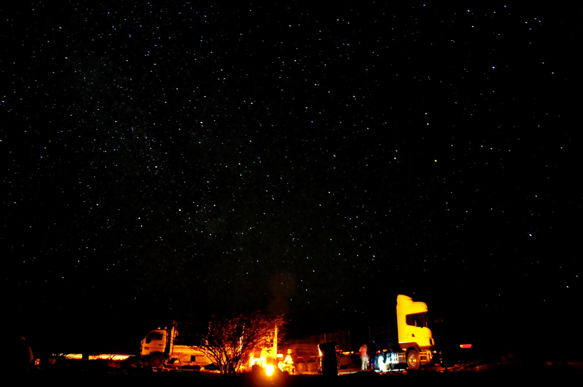 那天,恰好遇到了一个修路的工程队。他们有水,还碰巧赶上他们加餐。我蹭了一盆羚羊肉。黑夜覆盖大地,和工人们在火堆下一起聊天吃肉,我实在幸运。