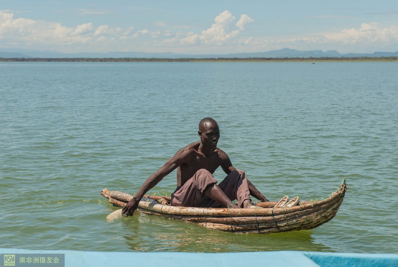 远处湖面上漂来一艘不知道是什么木头做的小船,木头是空心的,非常轻,黑人都不需要浆就可以轻松滑动,在湖里面行动自如,这就是湖里的渔民典型装备。