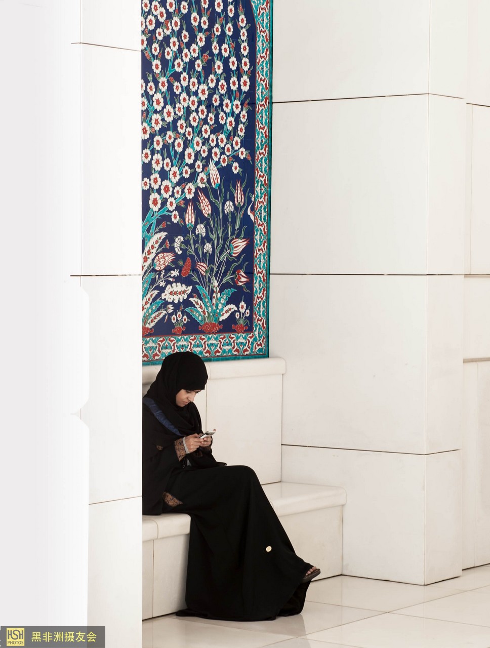一位迪拜女孩坐在清真寺的角落里用手机在上网聊天。