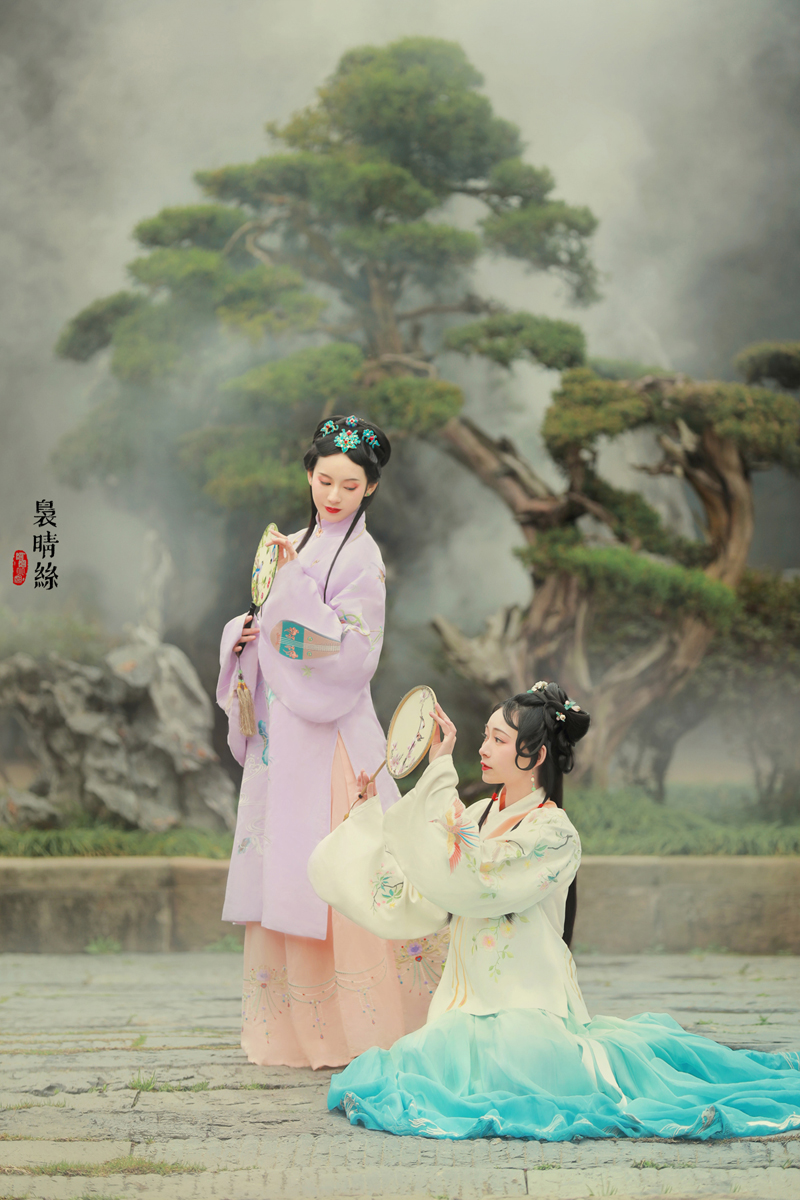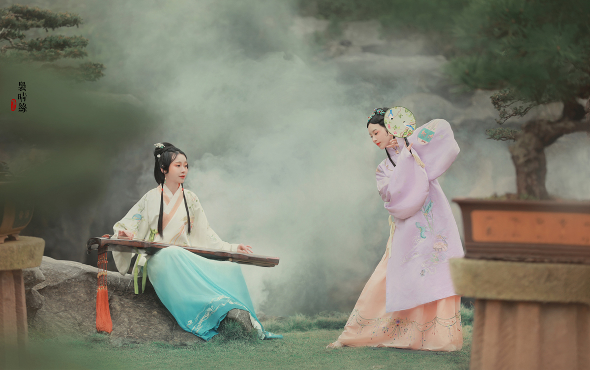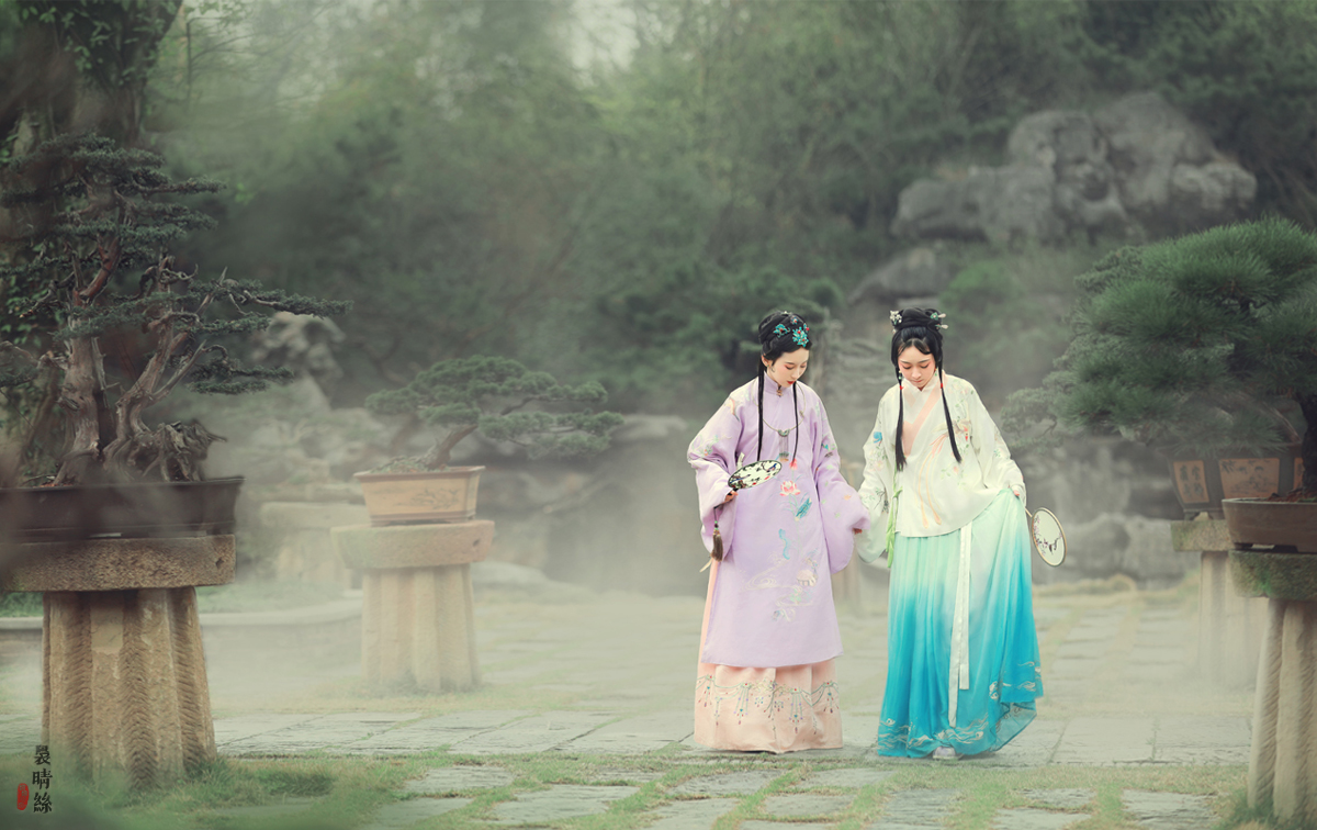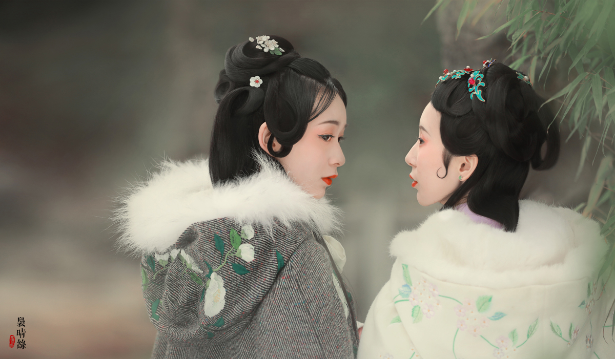 袅晴丝,闲庭院。菱花扇,美人面。烟波飘渺卷云鬓,霞光流滟彩衣剪。 抚瑶琴,整花钿。携香伴,春如线。双双歌舞怯春寒。姹紫嫣红皆开遍。 摄影/后期:@摄影师蝈蝈小姐 ,入镜:@司音儿 @欧琪琦是个美男子 , 服装道具规划/诗:@蔓殊菲儿本尊 妆发:紫衣@桃夭momoko 白衣@ACE-杏子