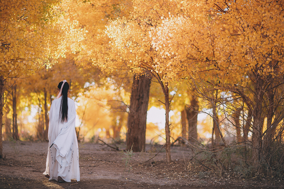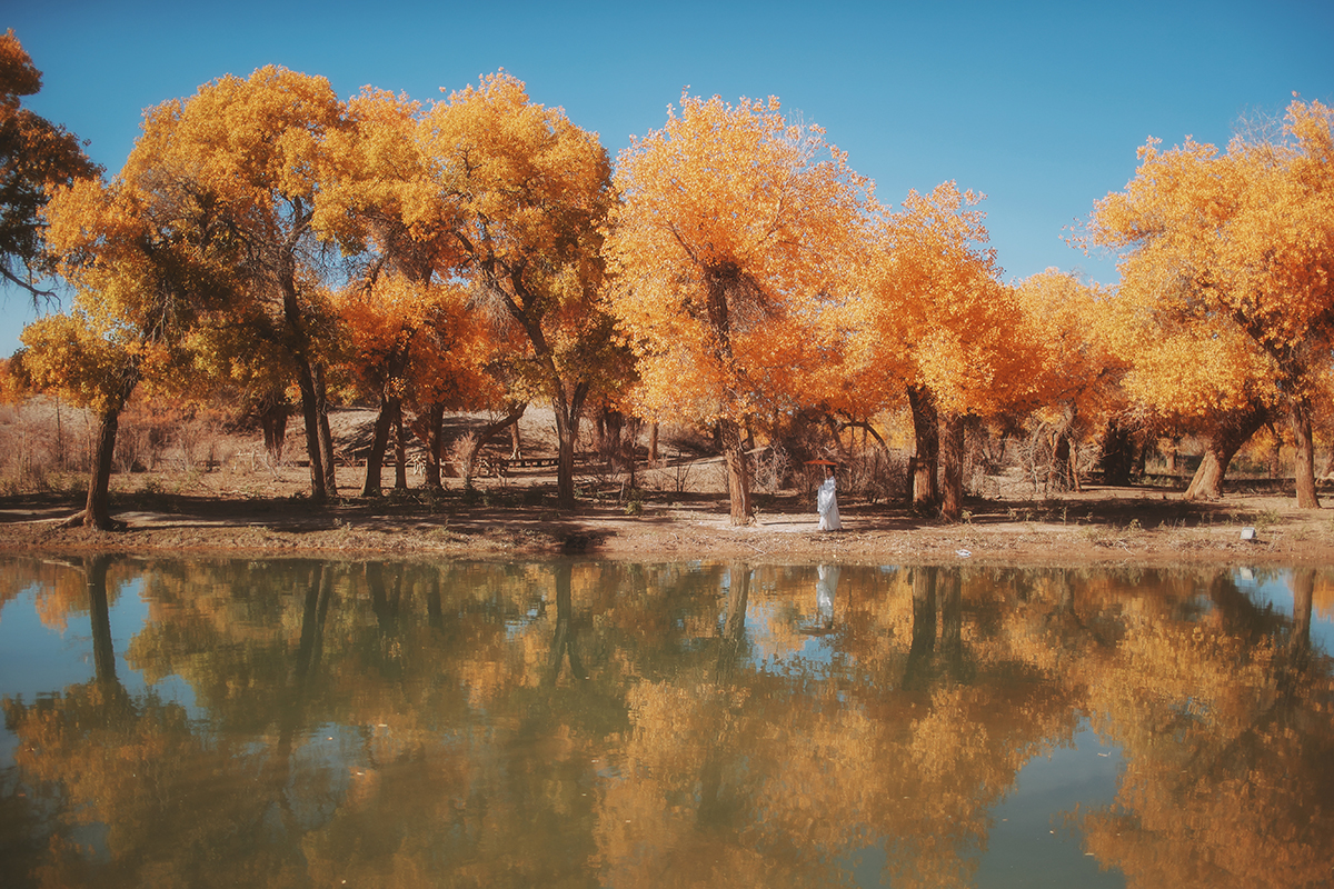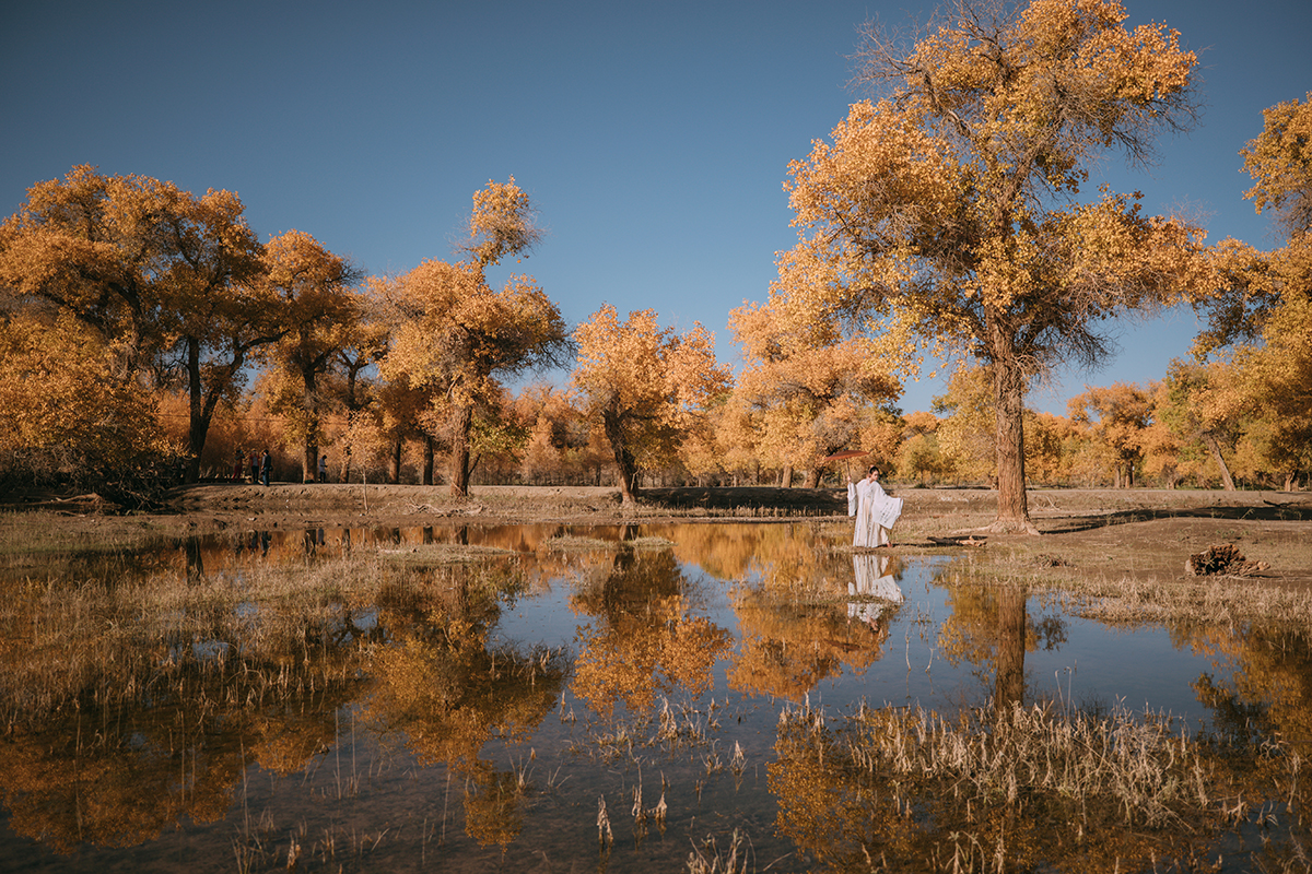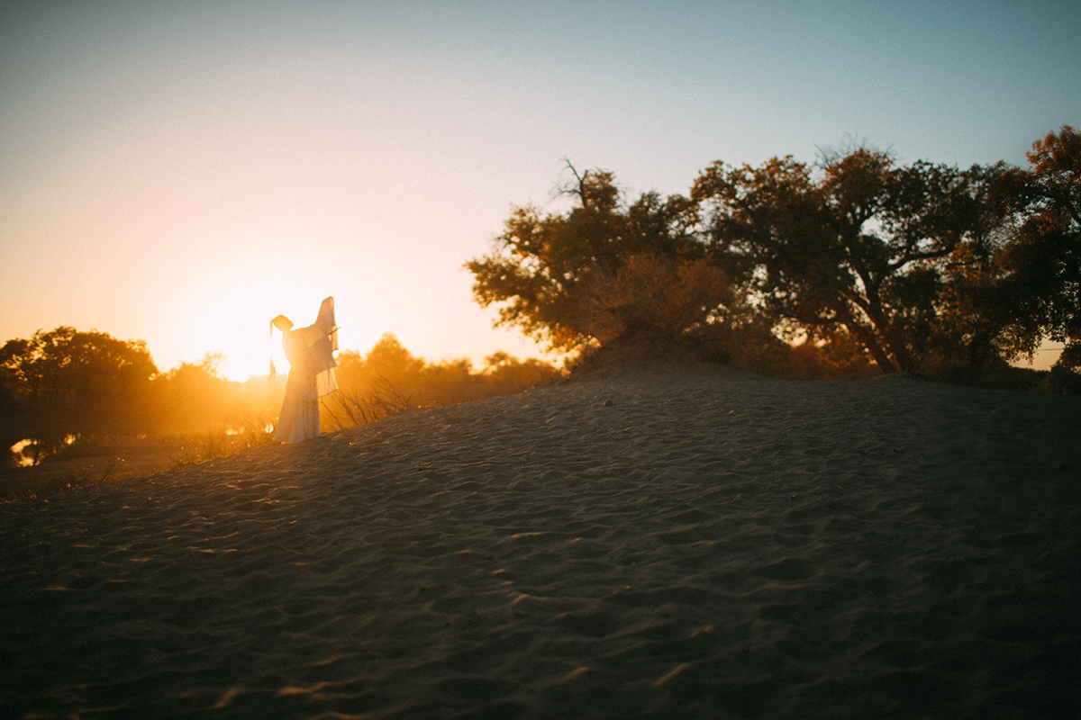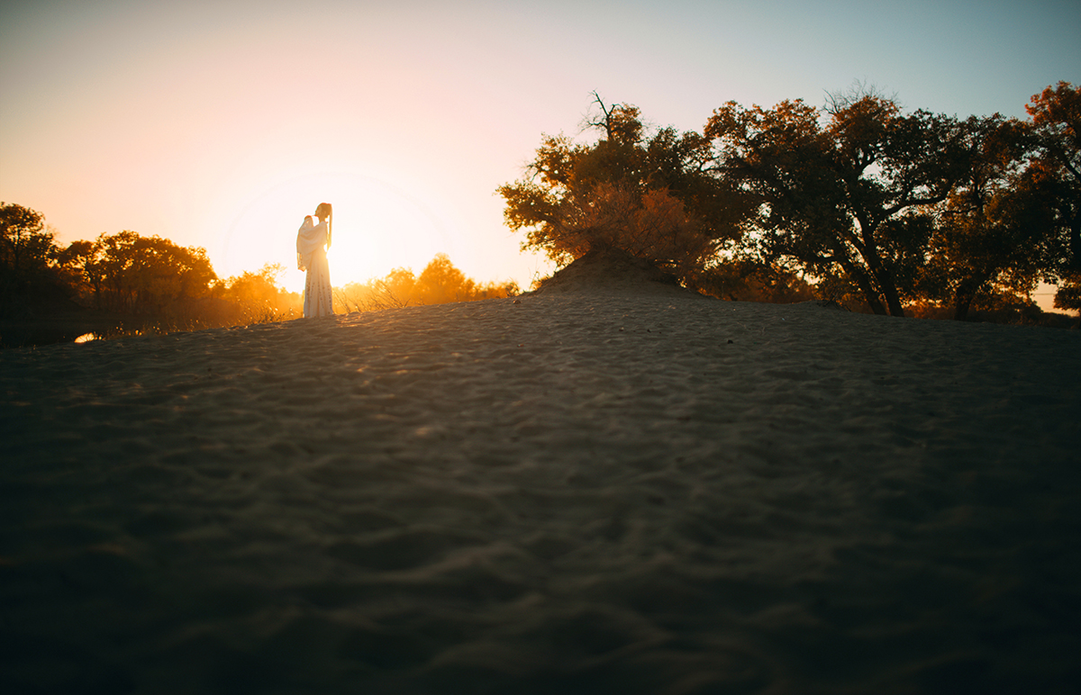 大漠广袤一望无际,金色的胡杨林在落日下凄美而绚丽;