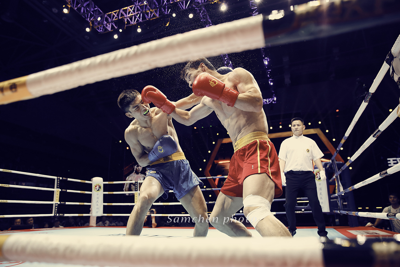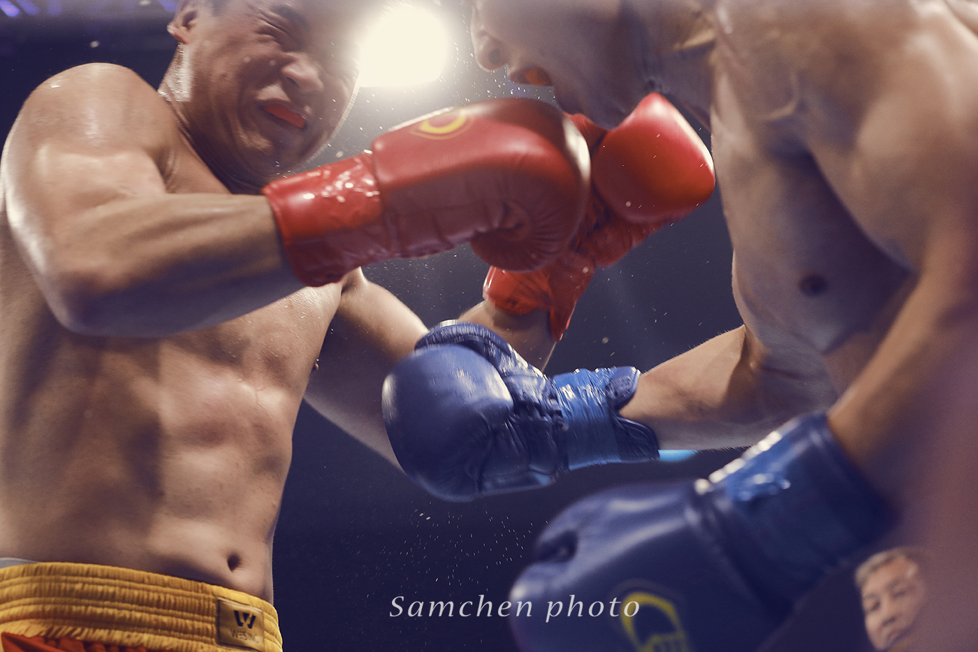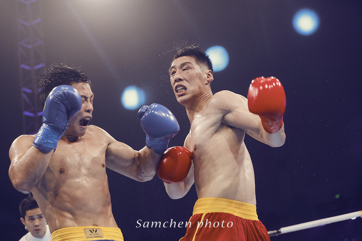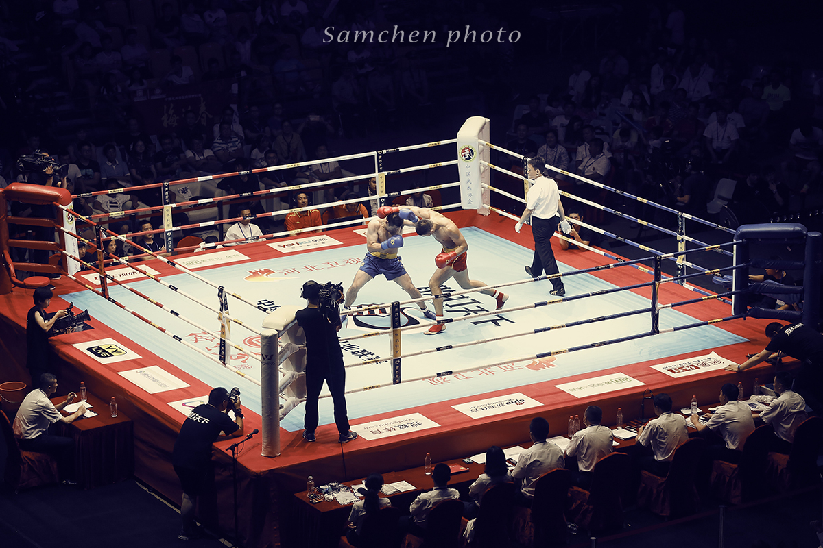 好在慢慢我们慢慢摸索到了拍摄诀窍,如果拳手挥拳了再按快门,那基本就是啥也拍不到了,必须要有预判有一个提前量,然后高速连拍。可怜了我的5D3,小齐的1DX这个时候优势就体现出来。第一次一个晚上拍掉2500多张照片。
