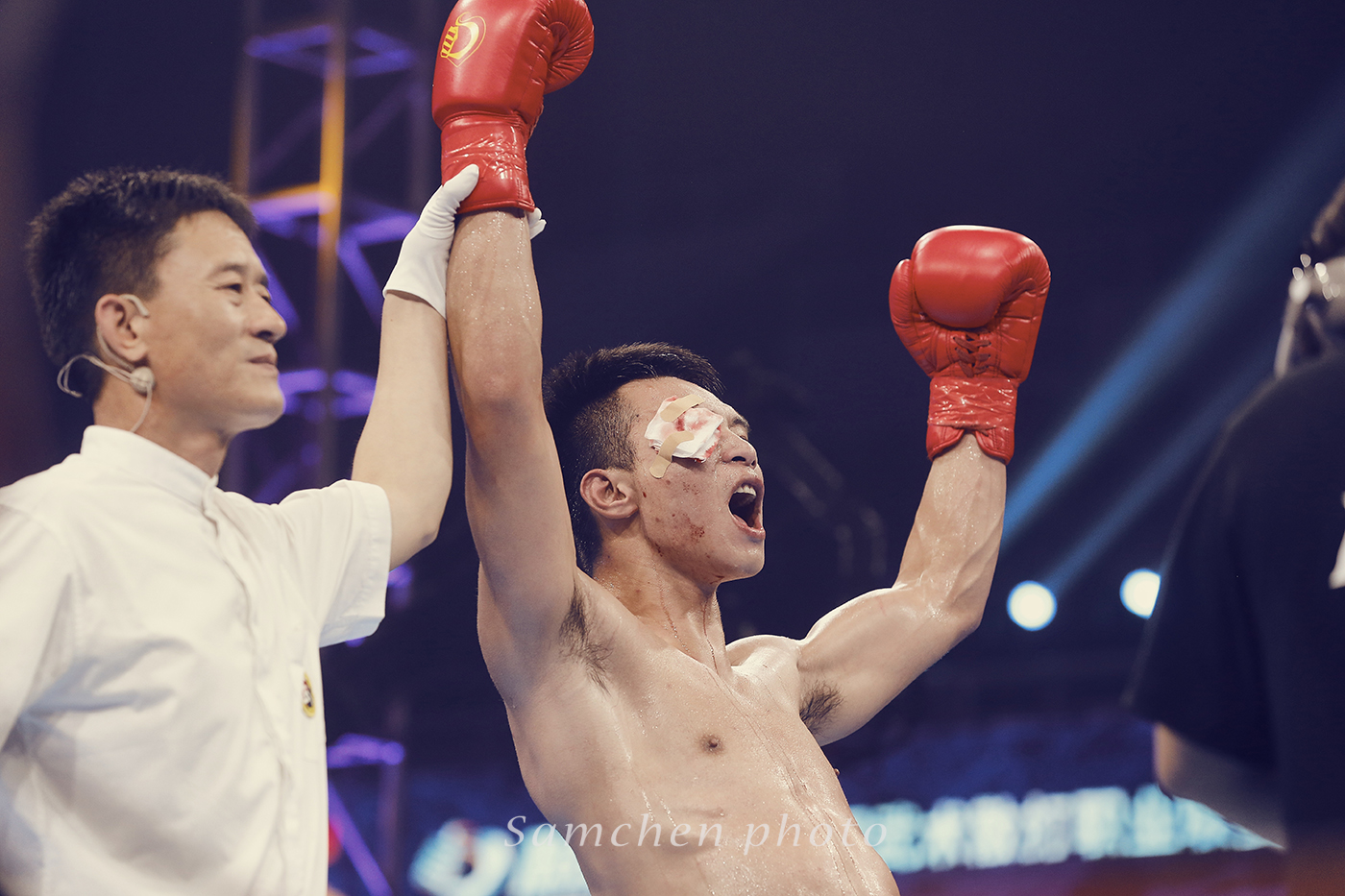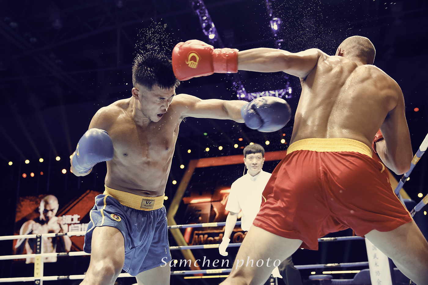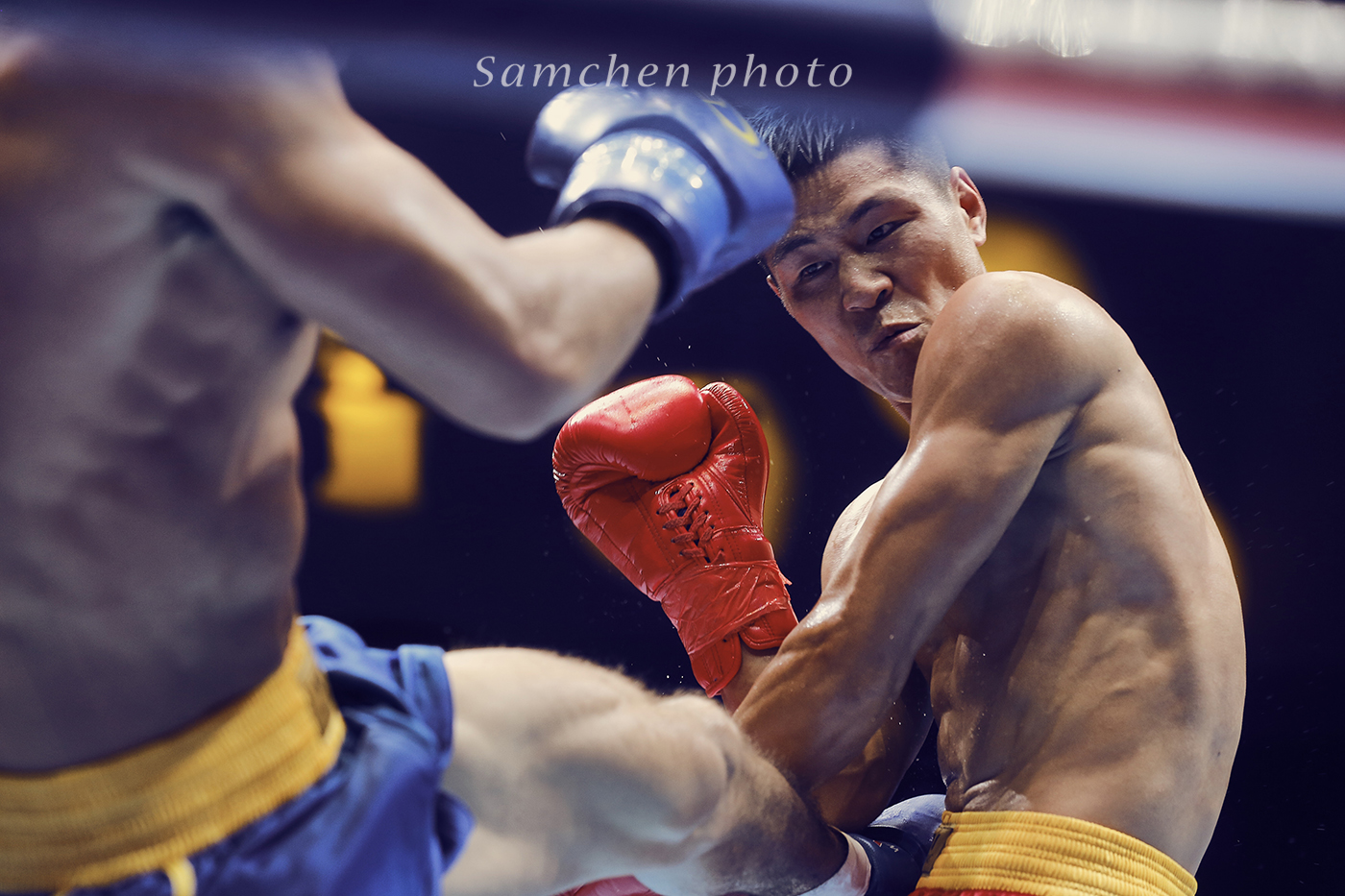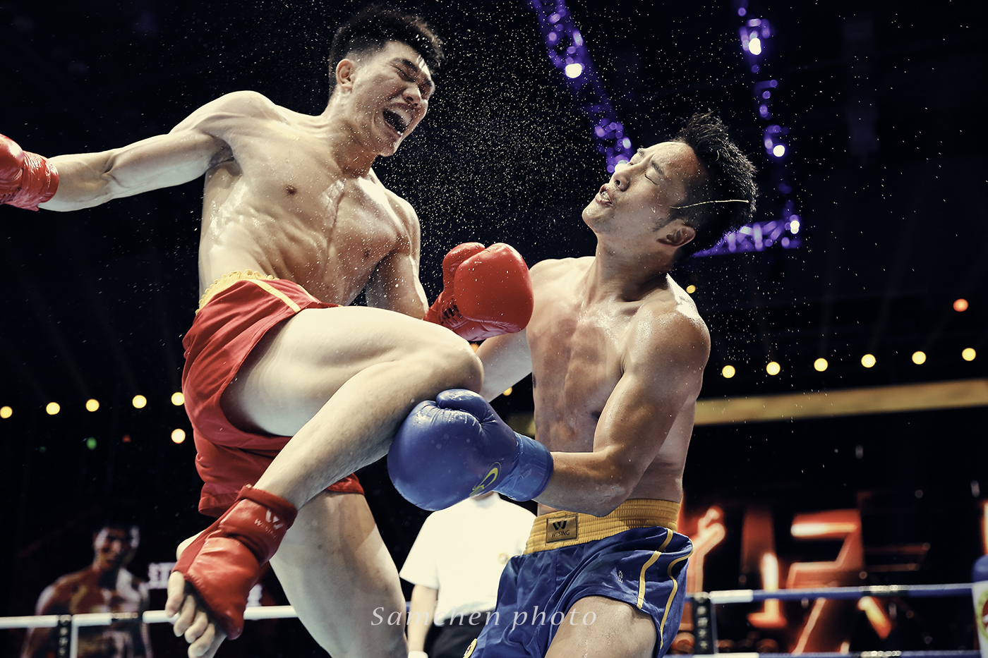 好在慢慢我们慢慢摸索到了拍摄诀窍,如果拳手挥拳了再按快门,那基本就是啥也拍不到了,必须要有预判有一个提前量,然后高速连拍。可怜了我的5D3,小齐的1DX这个时候优势就体现出来。第一次一个晚上拍掉2500多张照片。