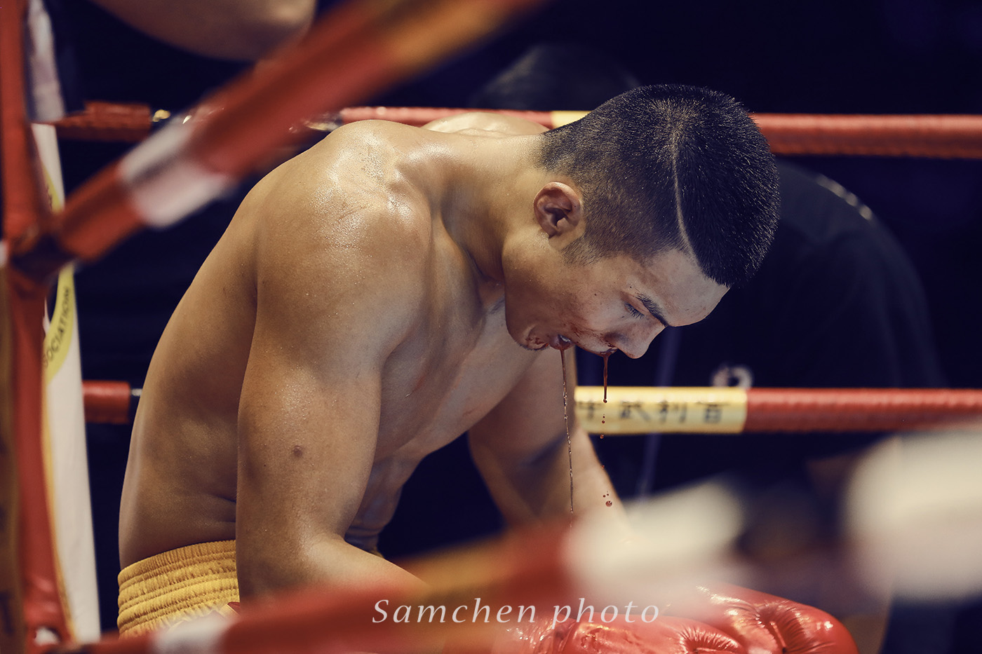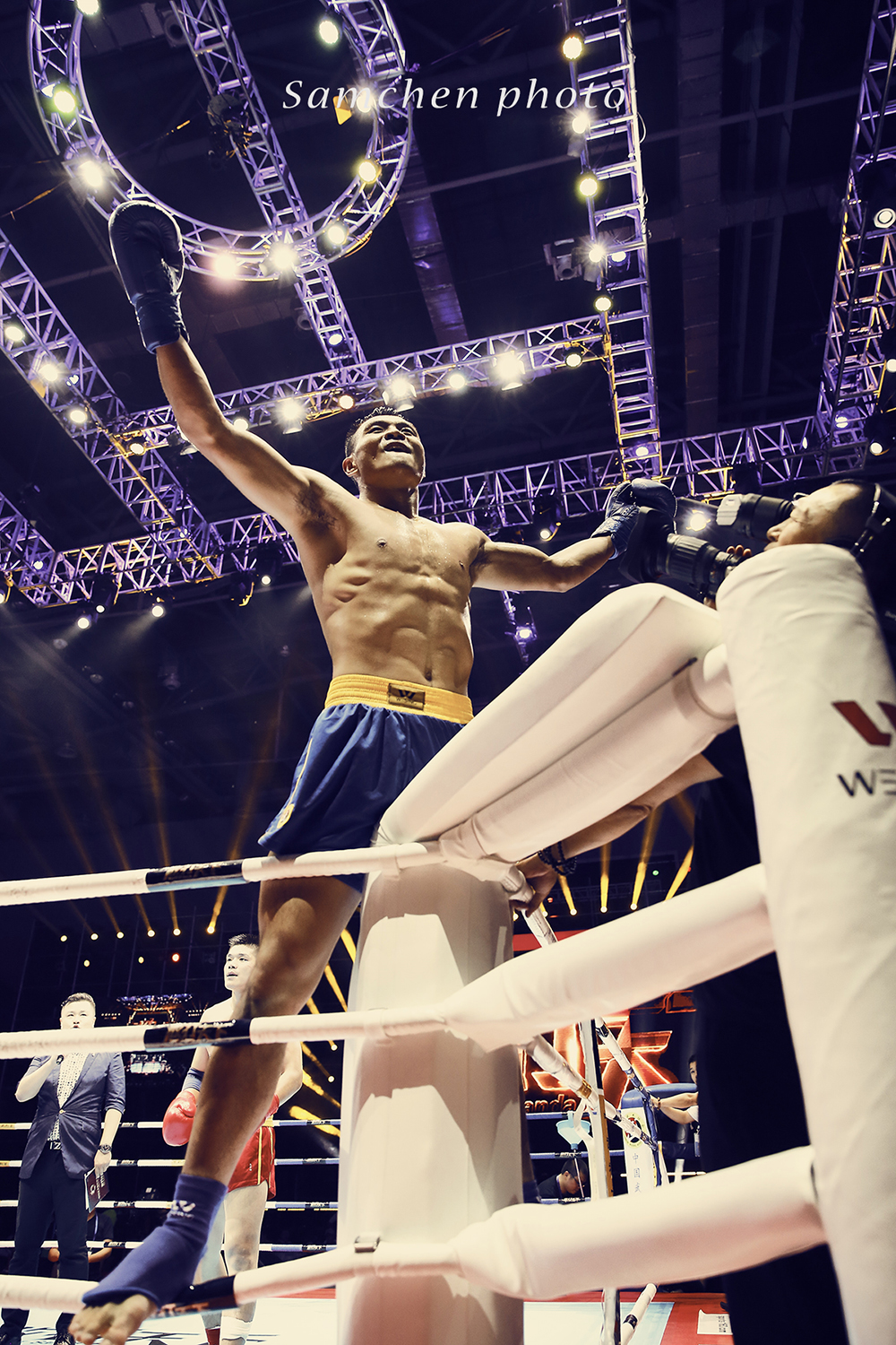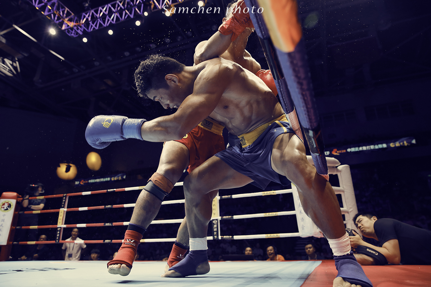 果真是有很大的不一样,从客户给我们Brief开始,只说了两句”栏杆不要做前景“”入肉“ 真是简洁明了啊。拍摄环境其实还ok,亮度充足,ISO2500快门就能达到800。但是一开始真的拍不好啊,舞台挺高的,因为有视频直播,摄影不能上台,只能趴着从栏杆的缝里拍,有时候拳手不在拍摄范围,有时候裁判挡着了,拍了两组,发现根本拍不到能用的照片!!!