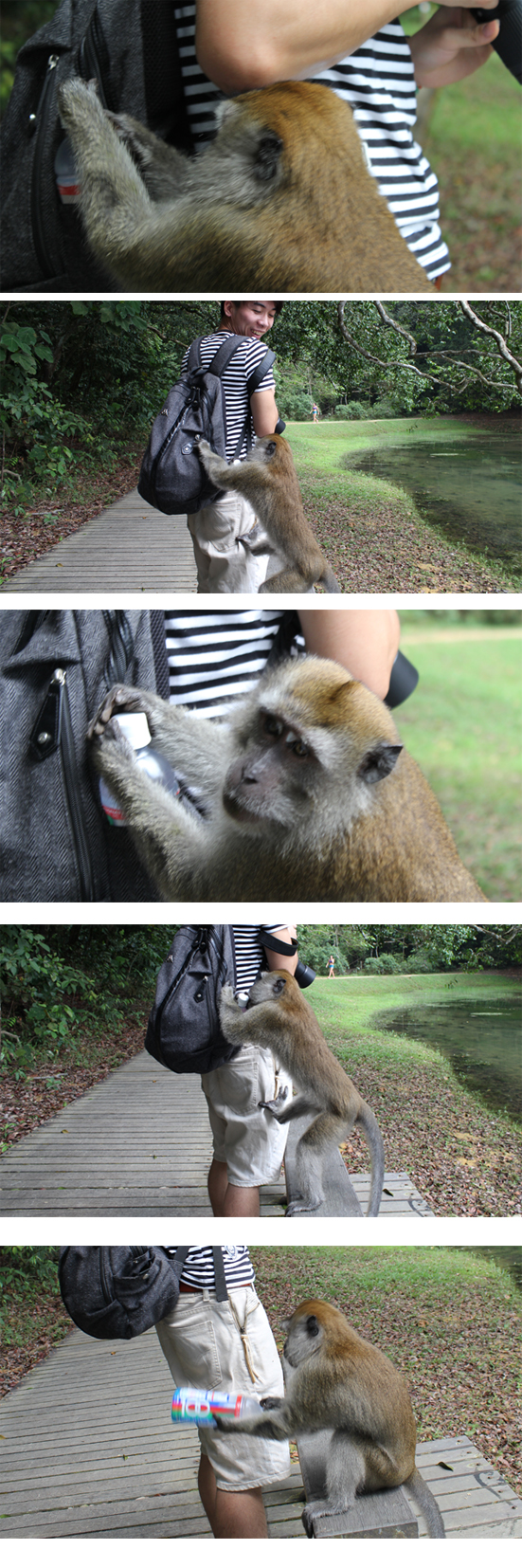 今天去 MacRitchie Reservoir 徒步,一直猴子突然从树上跳下来,然后站在我面前,见我没反应,就直接爬到我背包上,吓我一跳呀,原来它盯上了我的运动功能饮料100号,直接就把我的饮料给抢了,喝到一滴不剩。