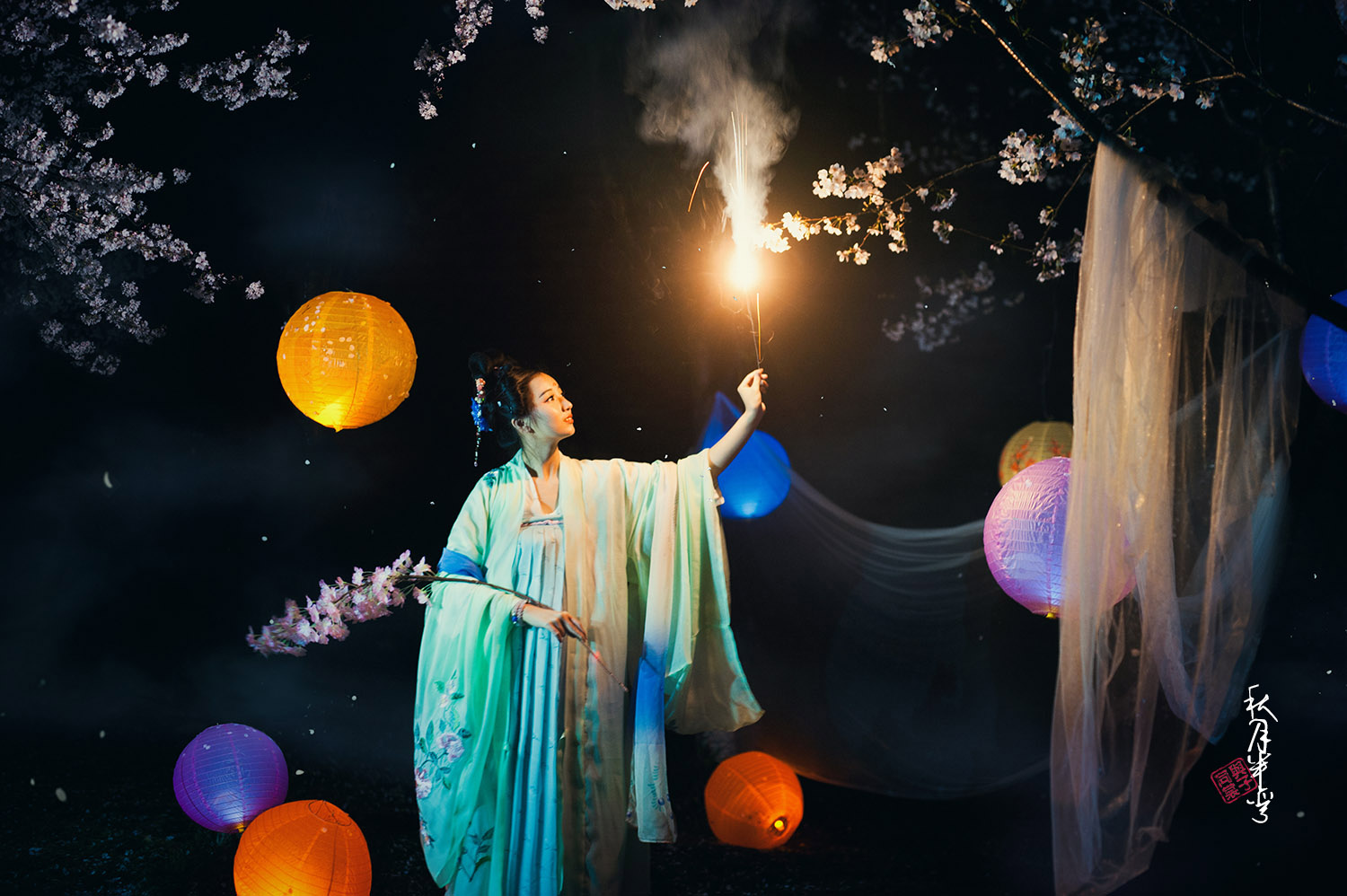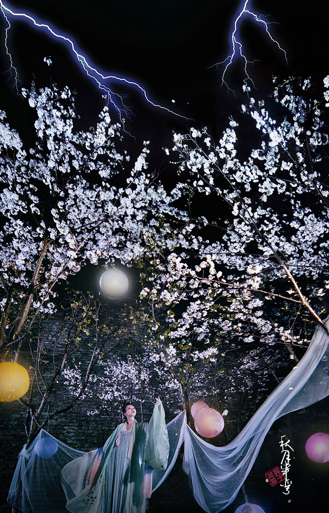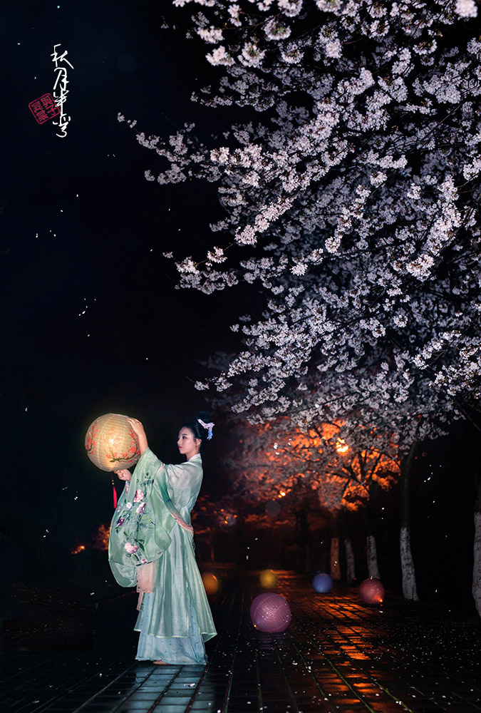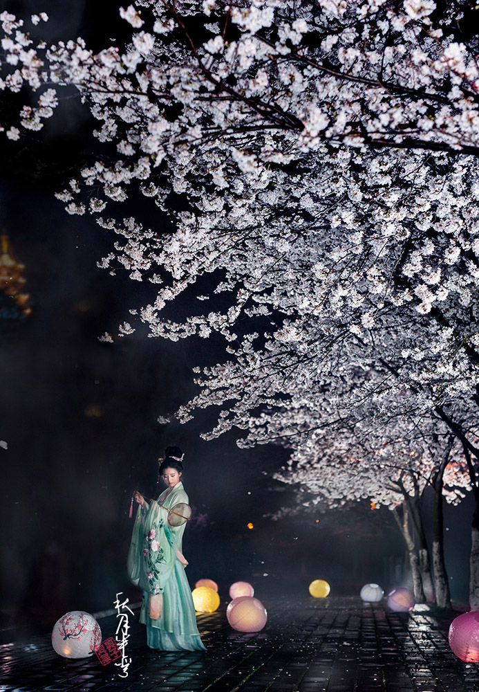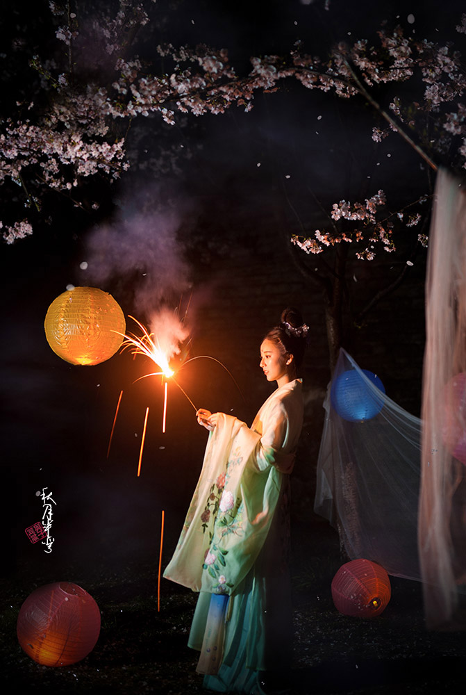 烟花绥飘雪 彩虹逐流星 暖帐醉红绡 冷雨击夜樱 桃飘妃子葬 李飞唐人吟 鸡鸣晨钟破 行人足下泥 摄影/文案:我 出镜:初卿墨如画