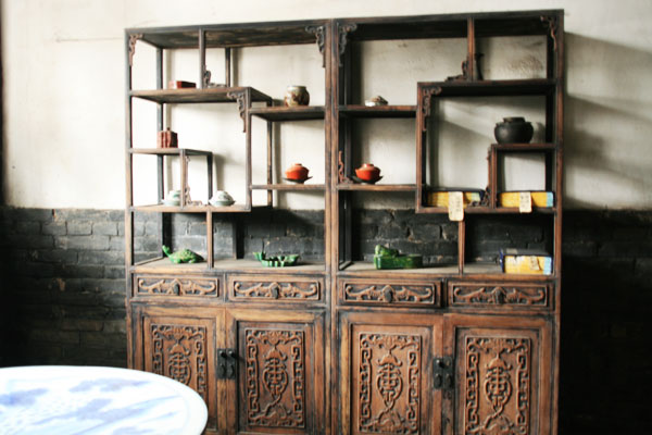 不知是什么年代的柜子,看它对称的设计、古老的雕花,在诉说着大户人家过日子的讲究与奢华~
