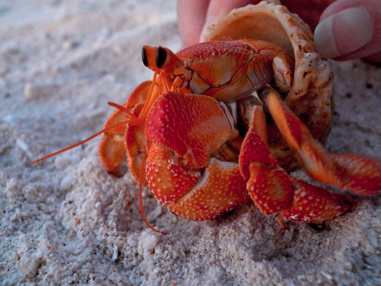 转身想走的时候,发现了这个小家伙,震惊了。一只被煮熟了的巨型寄居蟹?